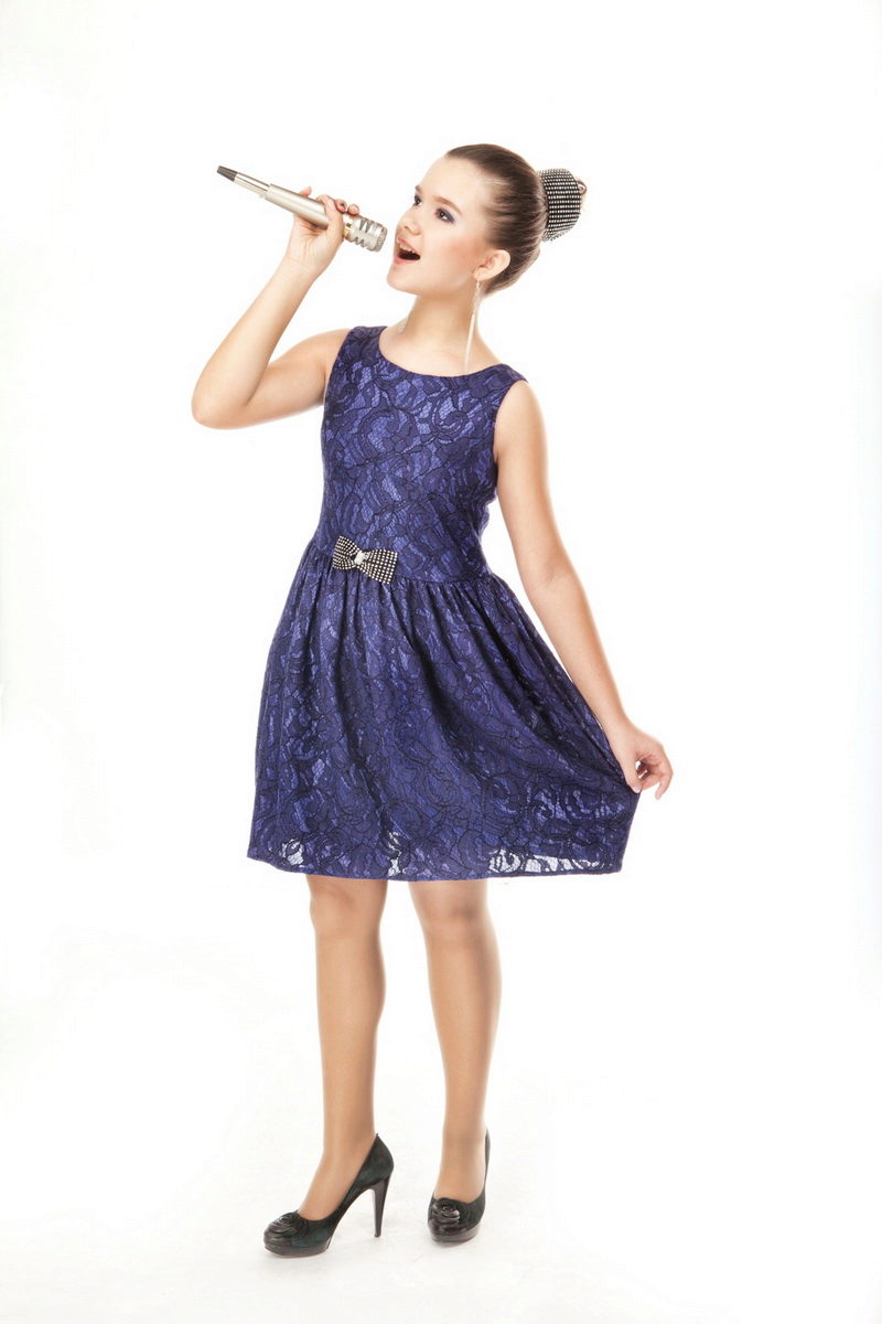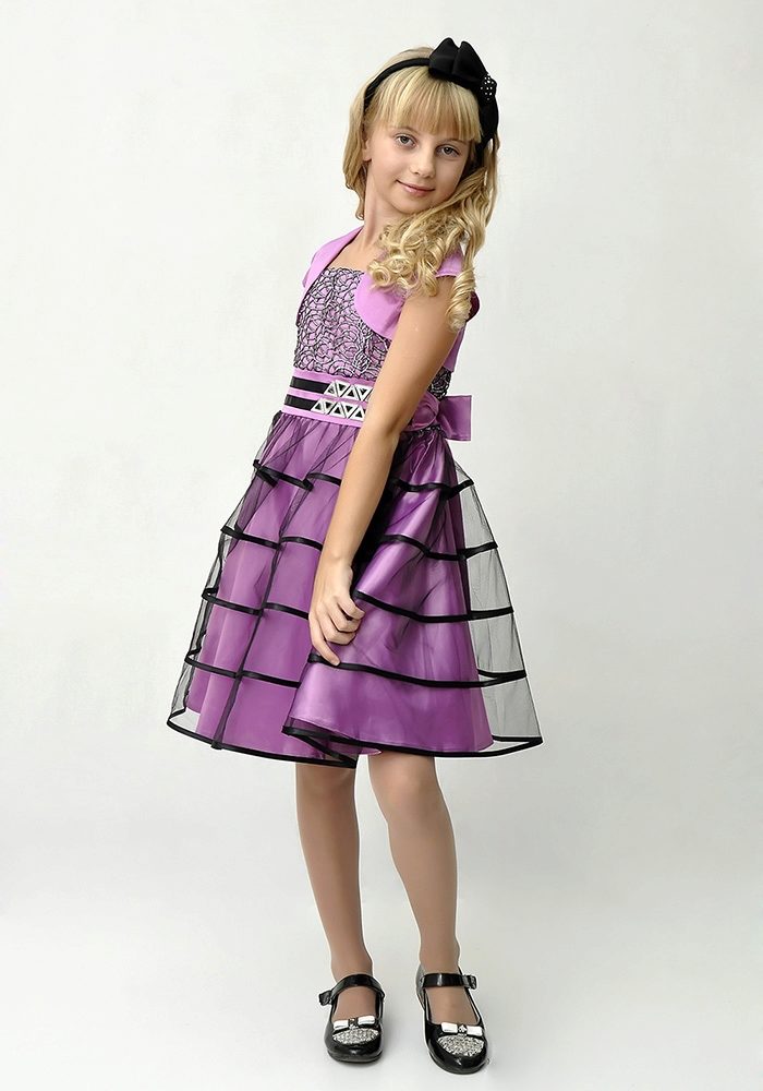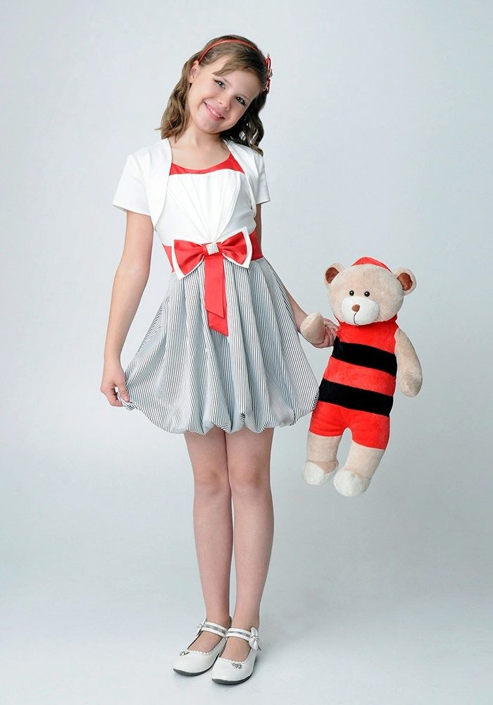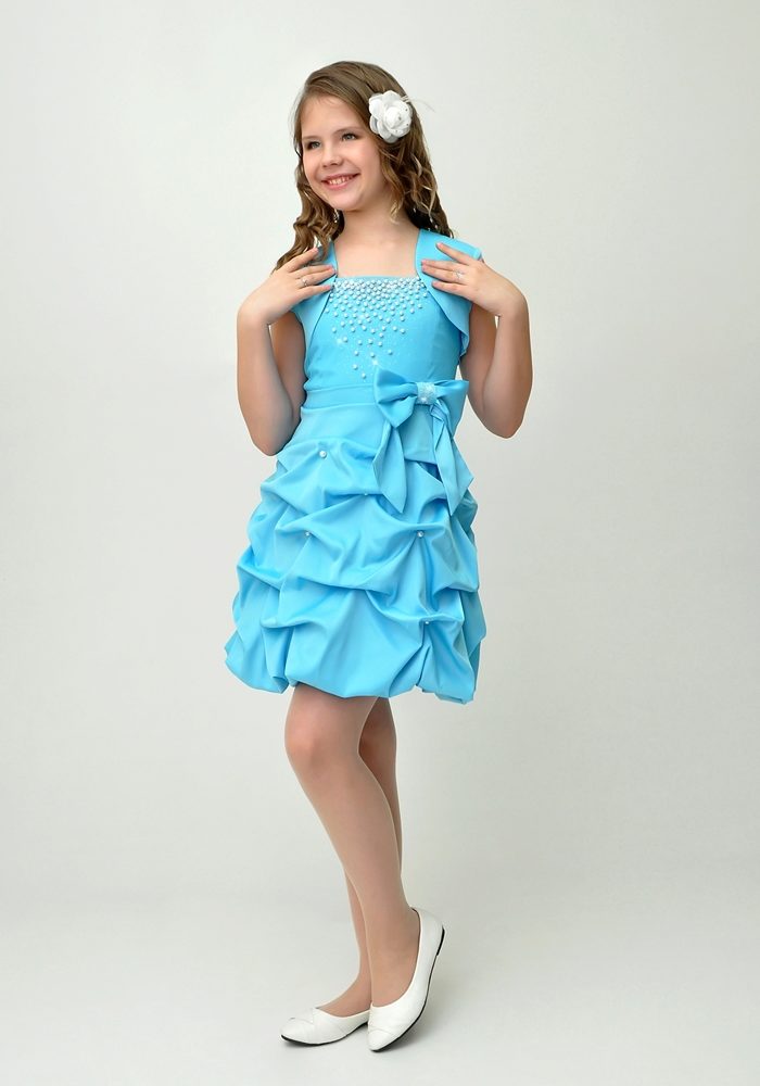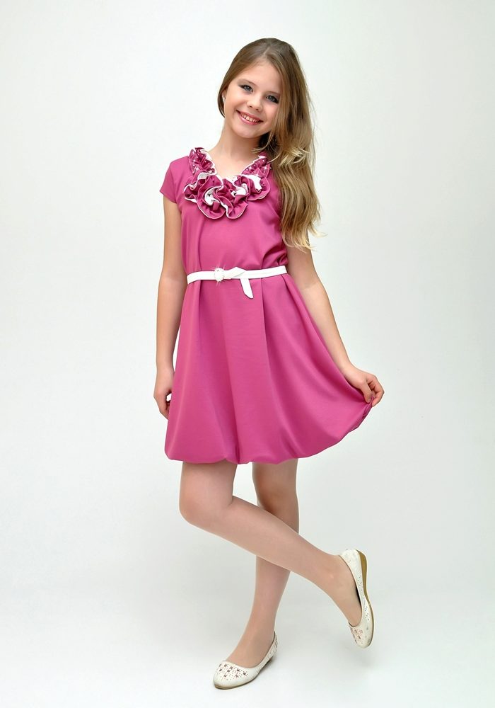 A skirt up to the knees, a fitted silhouette and a moderately fitting bodice will work well for little girls. It can be made in the form of a corset or a regular top with a boat neckline, V-shaped or round neck. The sleeves will add a romantic touch to the image, and a ribbon in tone to the dress will help emphasize the waist.