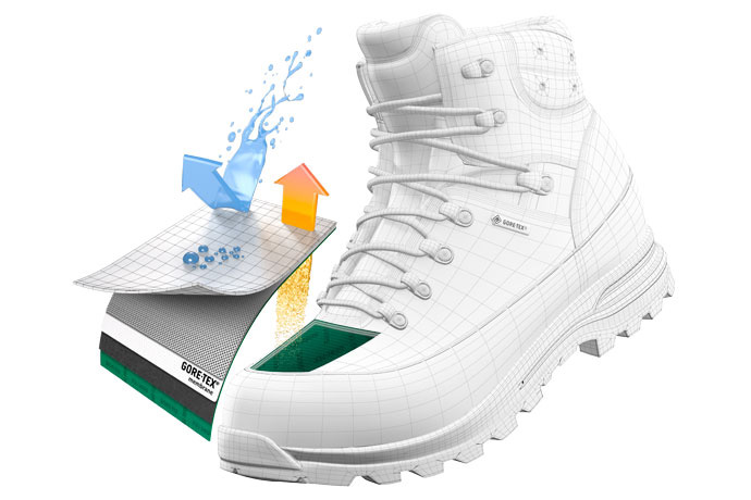 Membrane fabric, as a rule, is located between the inner and outer layer of the upper shoe. Micropores, which are several times smaller than the diameter of a human hair, perfectly let in excess moisture and air from a sneaker, but due to their tiny size they do not allow water molecules to penetrate inside. Due to this, the foot in such a shoe will always remain dry.