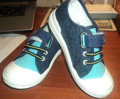 - blue sneakers with white laces and locks near the tongue, decorated with a bluer light blue lace;