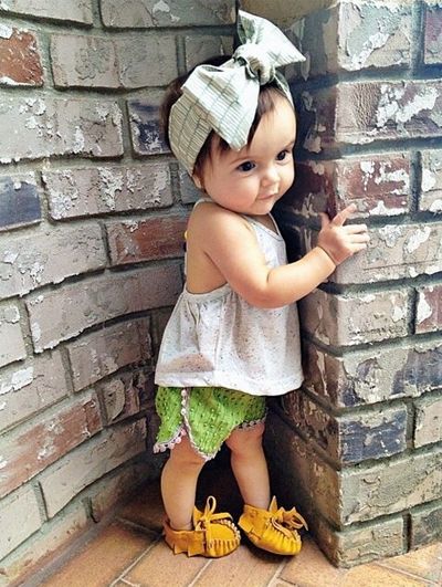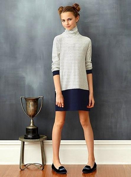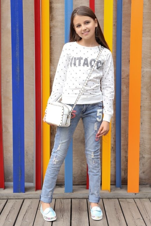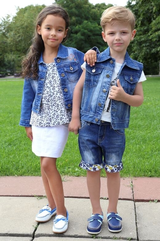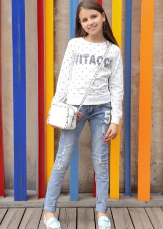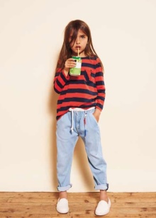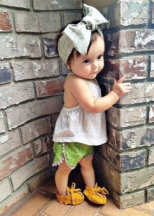 Girls of preschool age can combine universal moccasins with classic jeans, knit shorts, light shorts and skirts. Upstairs, you can wear a regular T-shirt or jersey when it comes to the summer season. For a cool spring or autumn, it is better to choose jeans, a warm sweater or a turtleneck.