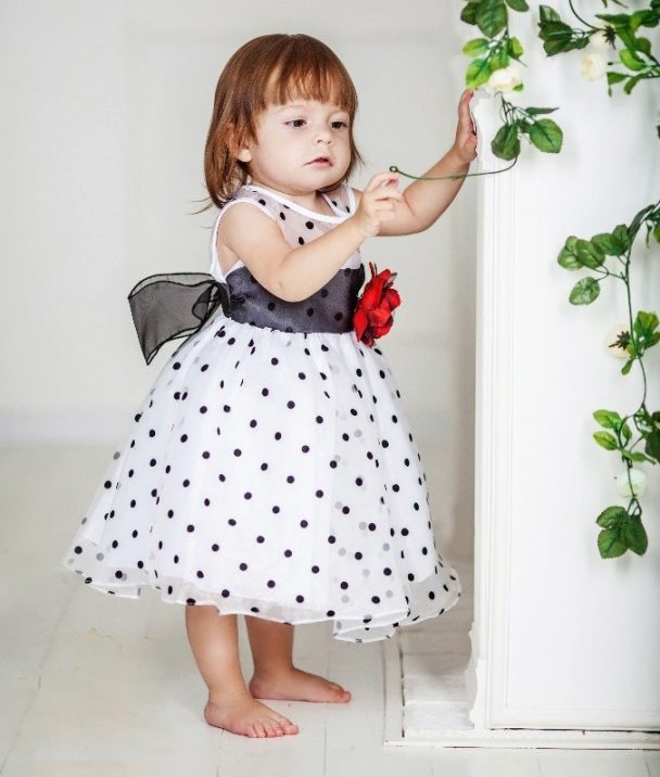 Choosing a dress for a crumb, first of all consider its comfort and safety. Therefore, give up the lush and long models in which it will be inconvenient to move. Also, it should be easy to put on and take off, because it can be difficult to dress up a little beauty, much less undress.