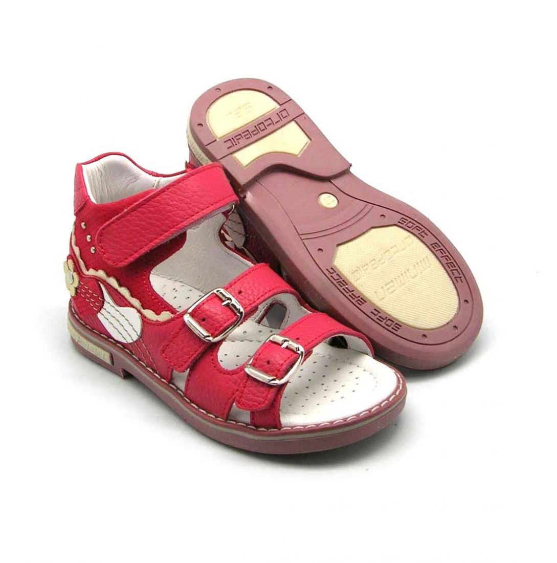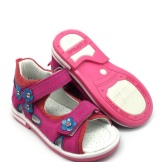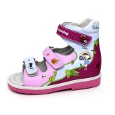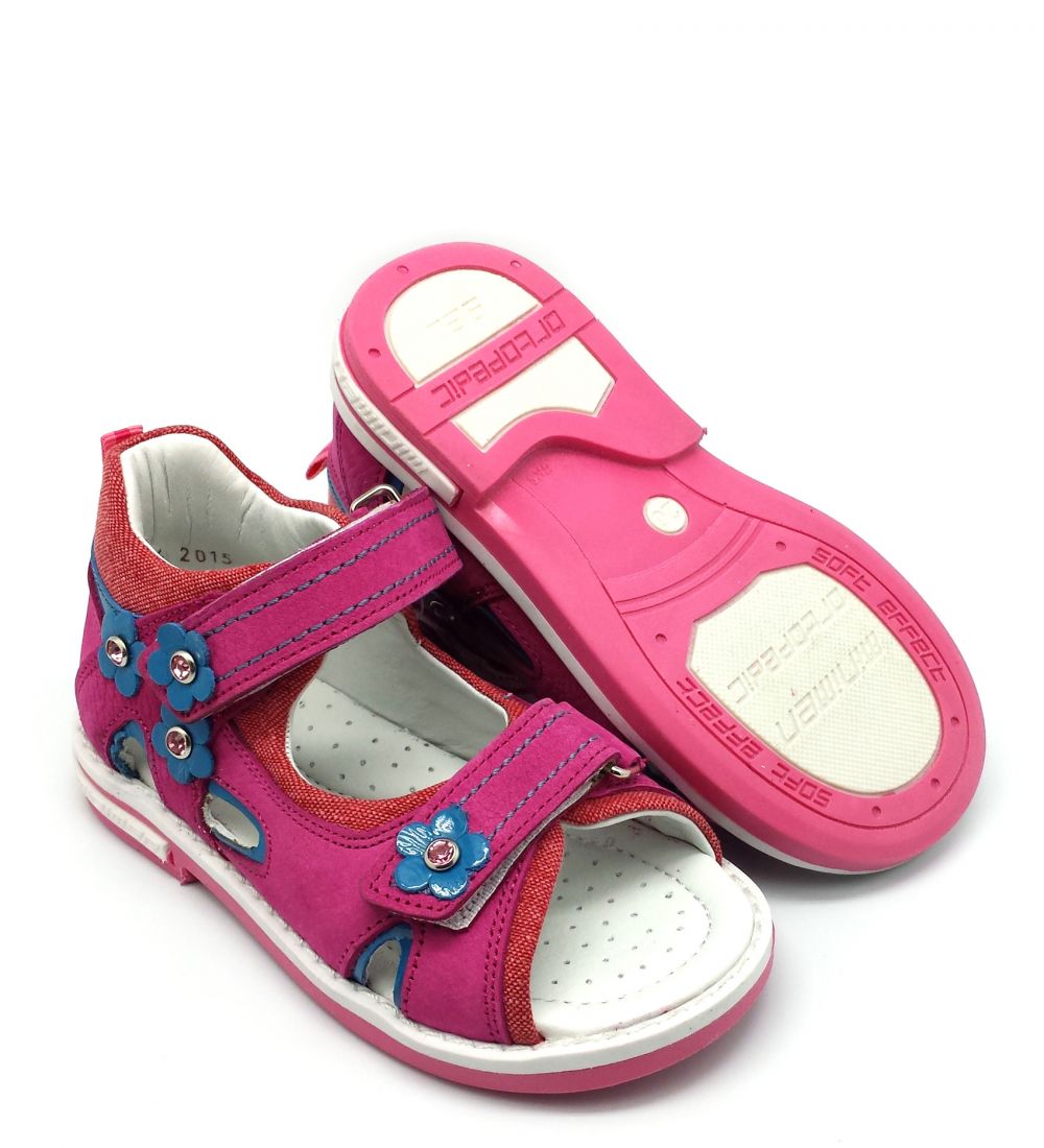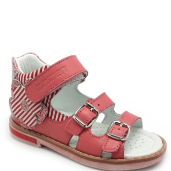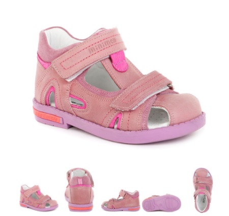- The following model is suitable for a girl aged 8-10 years. It is made of suede delicate pink color. These sandals are quite versatile and are suitable for regular walks or stays in kindergarten. A very comfortable velcro closure will allow its owner to easily take off and put on shoes on their own. Interesting interlacations of straps and inserts of more saturated pink color act as the main decoration. Rubber sole flexible enough and suitable for active children's games. In addition, this model is orthopedic and is perfect for girls with impaired formation of the foot. Very comfortable and incredibly comfortable model.