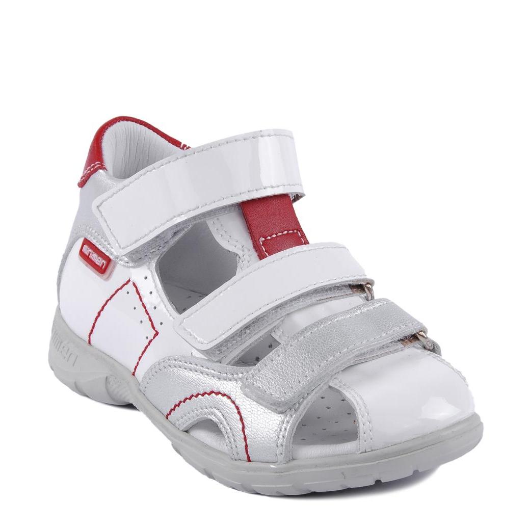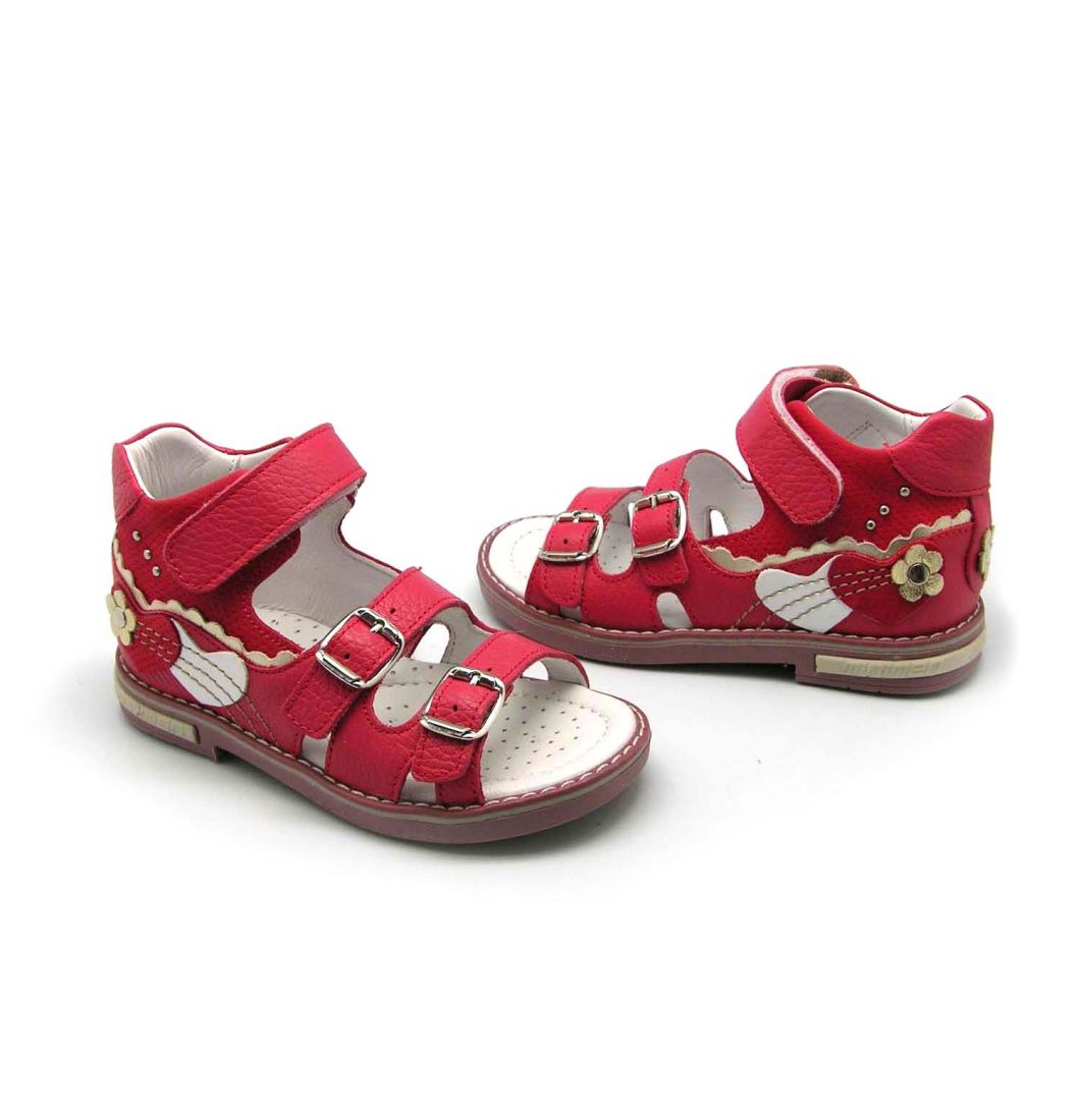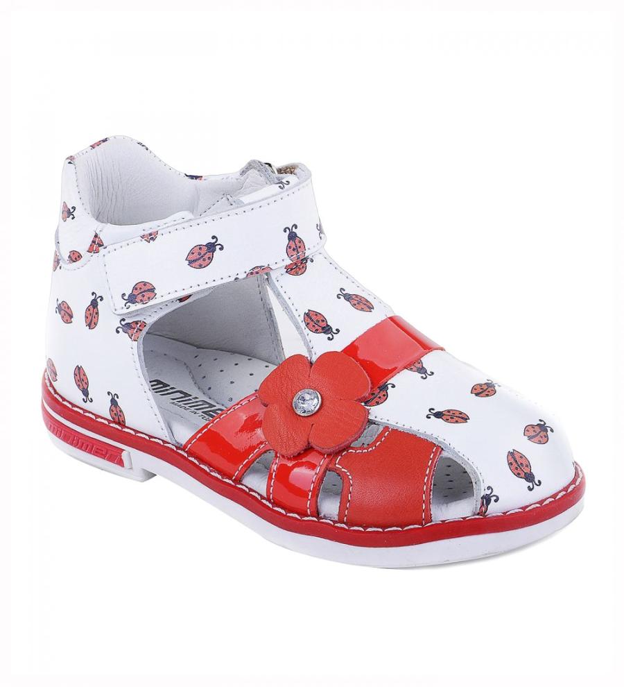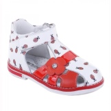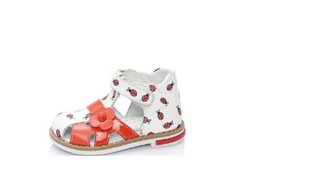 - The first model of closed sandals will definitely appeal to a girl of 5-6 years old. It is made in a very bright and noticeable design, which is able to cheer up its little owner. Part of the sandals is made in rich red color and is decorated with a strap with a decorative pretty flower. In the same color, there is a small pattern that emits ladybirds on a white background of sandals. The material for the top and lining served as genuine leather, which will not rub the girl’s tender legs and maintain the look of the product for a long time. The sole is stitched qualitatively, there is a small heel.