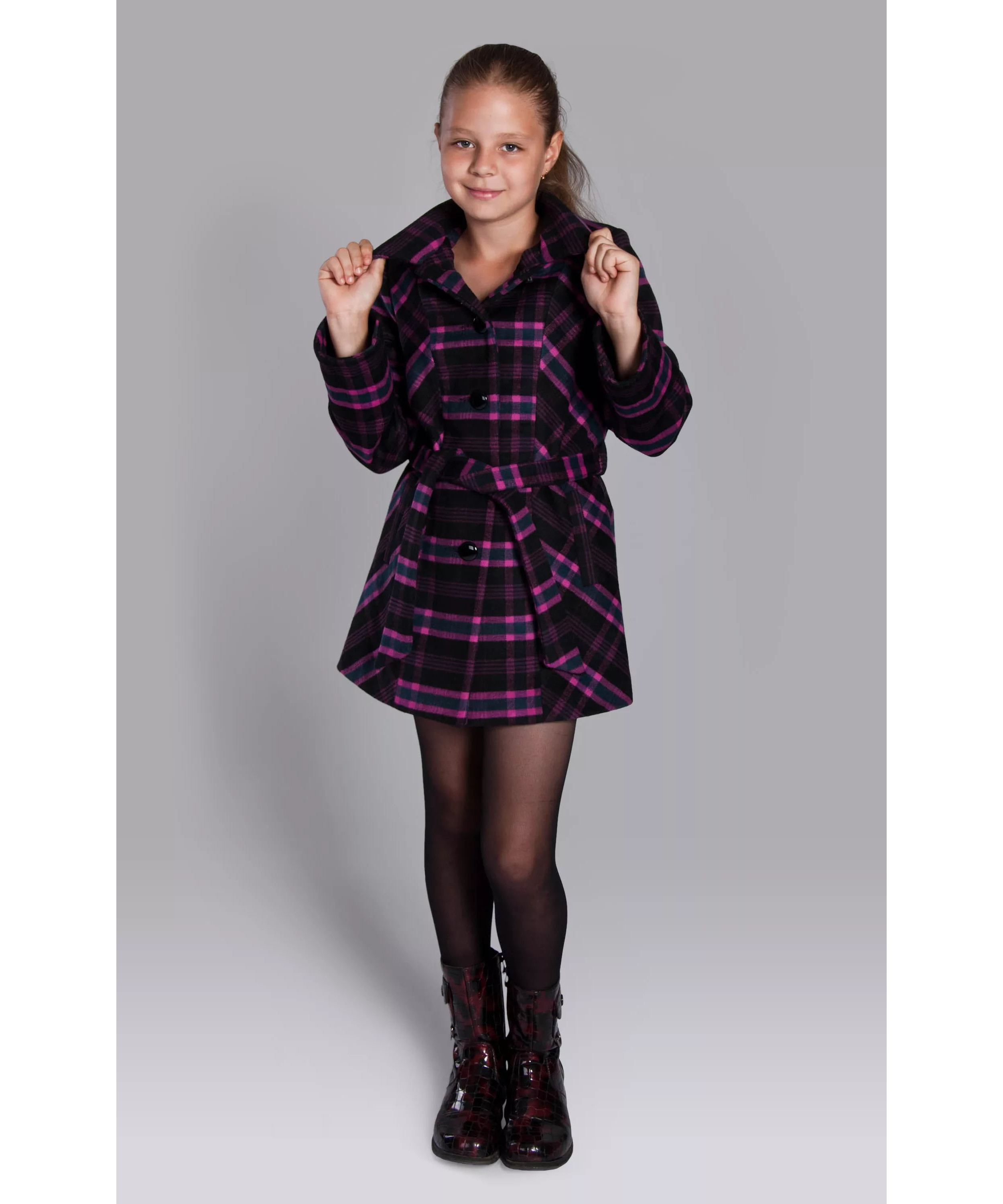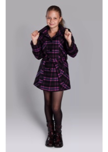 An elegant image for girls can be created from narrow suede boots to the knee, a short checkered skirt, a white sweater and a black coat with a straight cut.