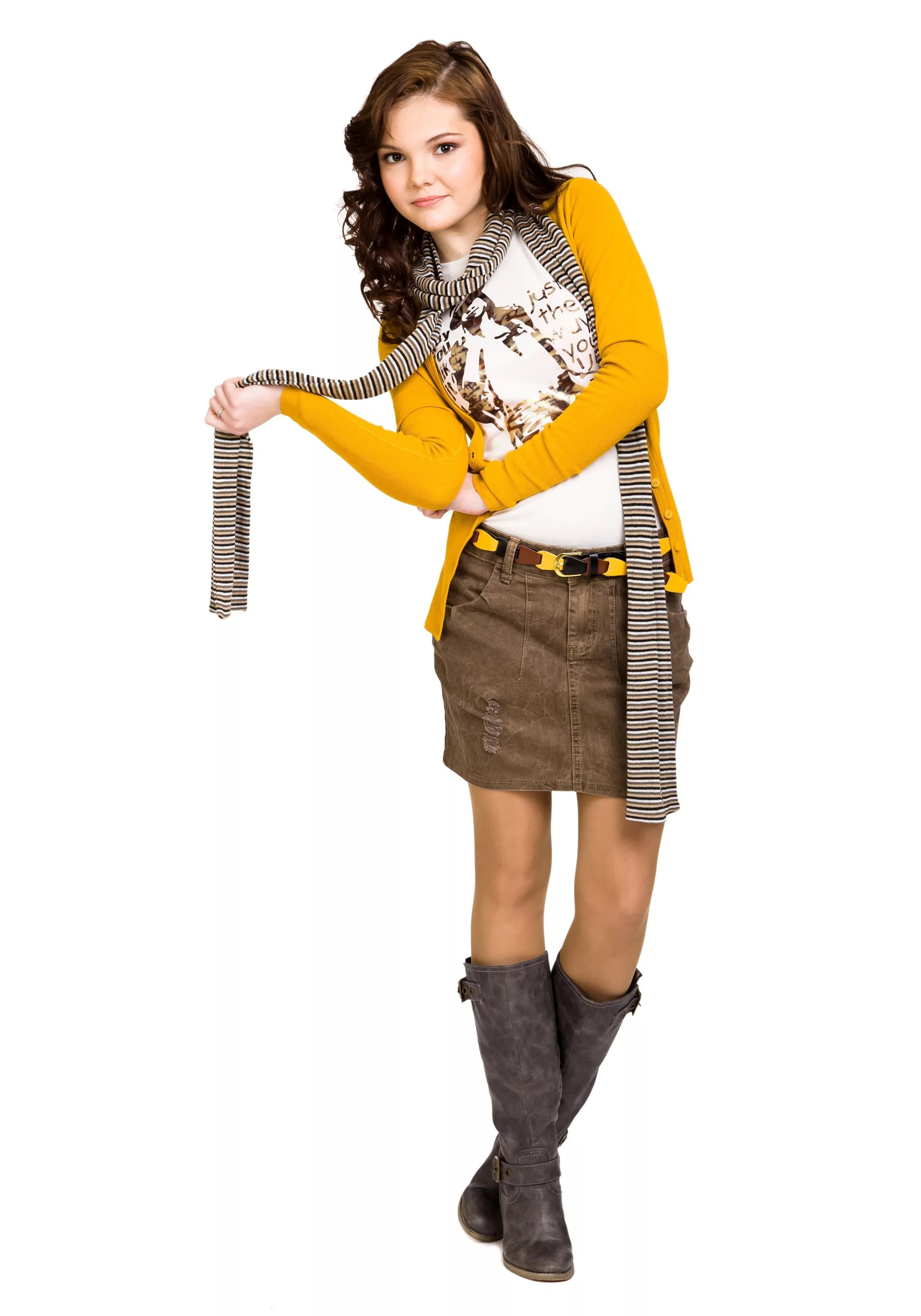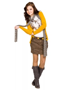 A school ensemble will look fashionable if you wear a denim skirt and a yellow cardigan with coffee boots. The striped scarf perfectly completes the bow.