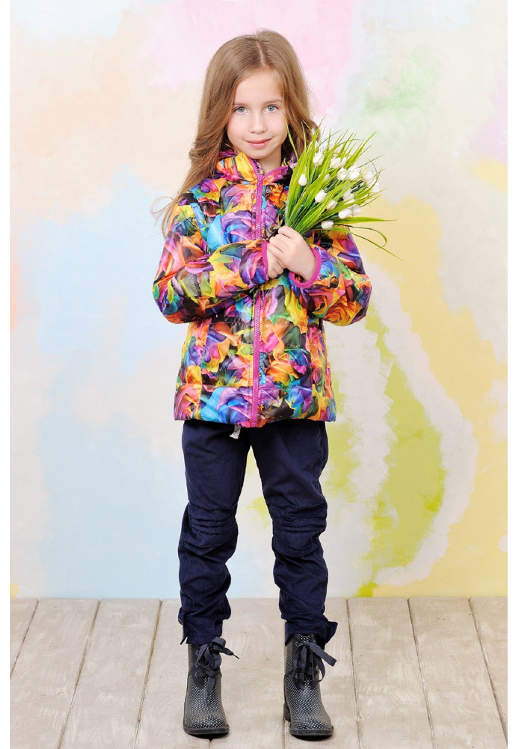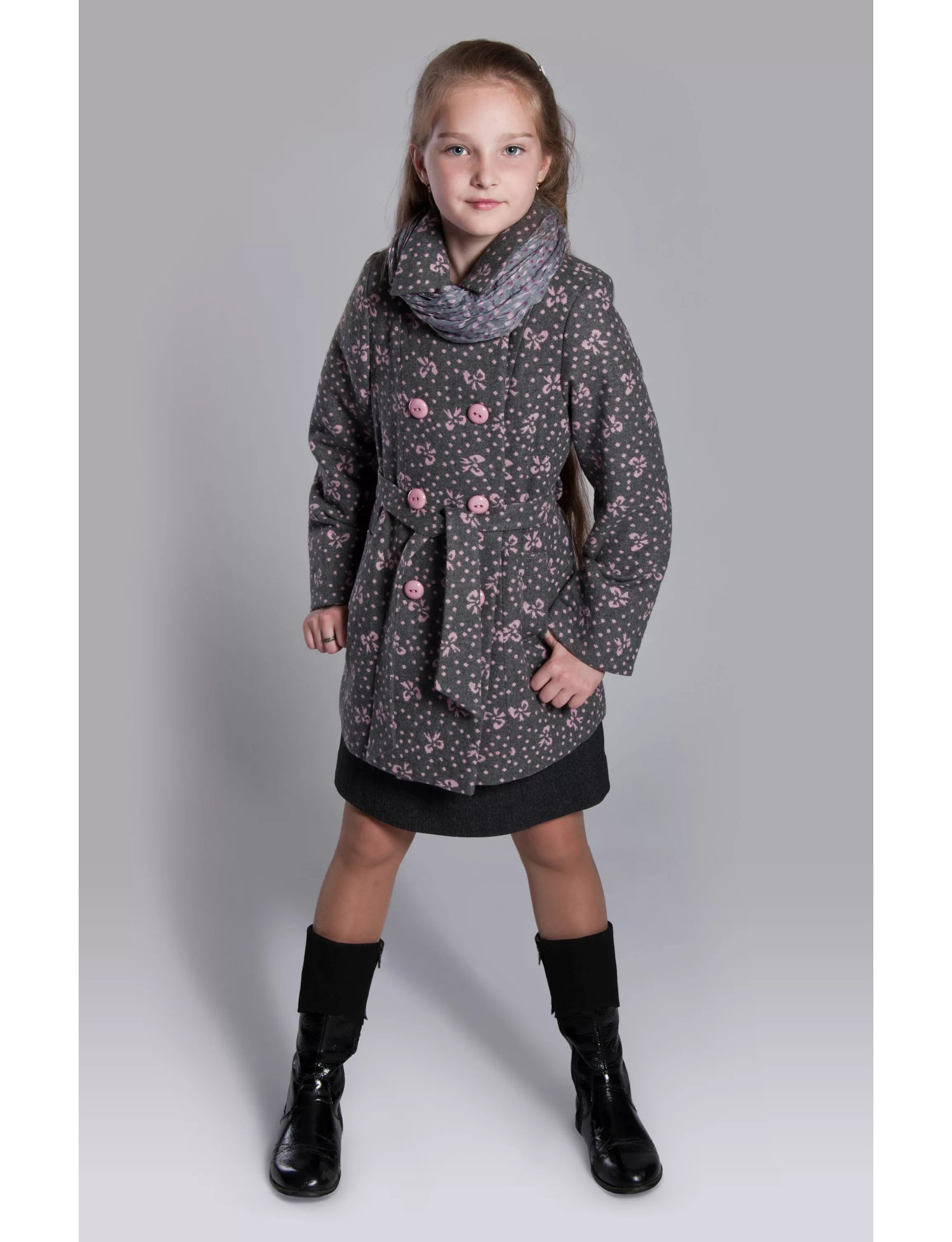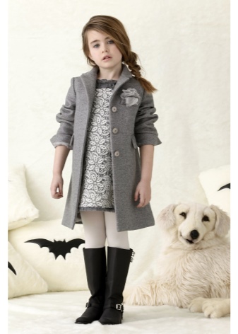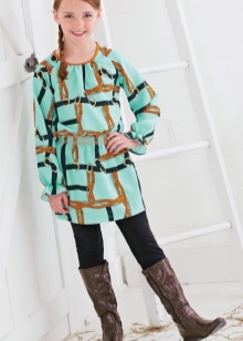 Young fans of rebellious style wear boots with a minimalist decor, a dress-tunic, socks and a jacket with a pattern and a buckle on the buttons. Accessory can be a hat to match the boots.
