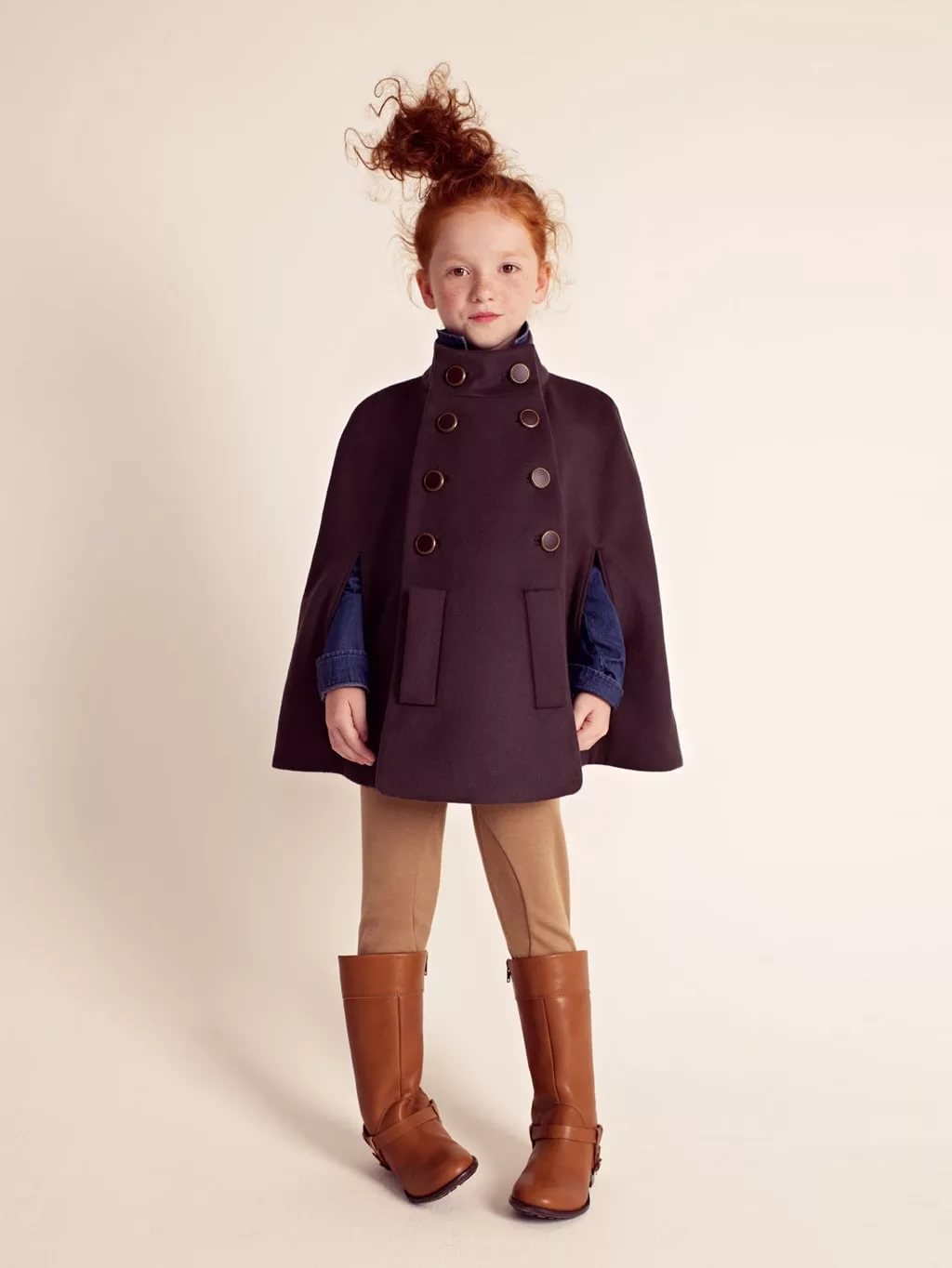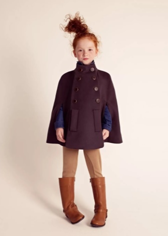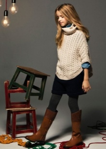 Brown half boots with a narrow tops are combined with the classic image. Fashionable poncho with a stand-up collar, narrow trousers will allow girls to look very modern among their peers.