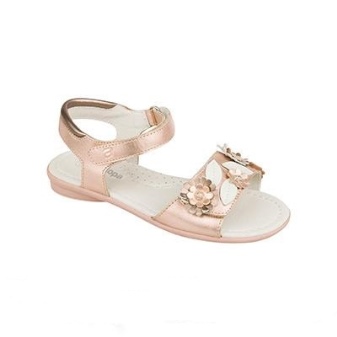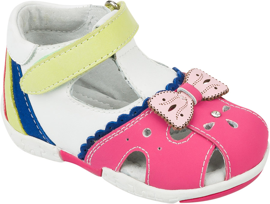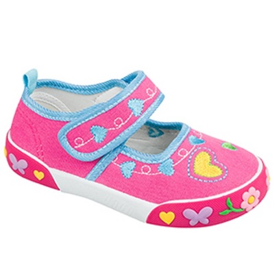 The hit of the season became closed shoes with a sole having a pattern. The bright pink color of the base with a pattern of lines is decorated with a patterned sole with butterflies fluttering on the flowers. Velcro with a smiling sun will help teach the girl to put on or take off shoes.