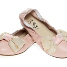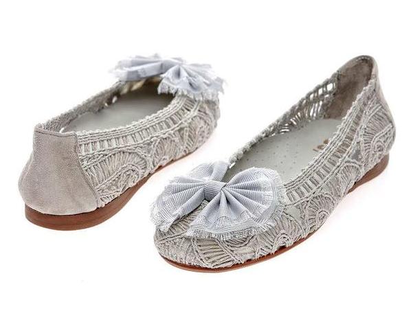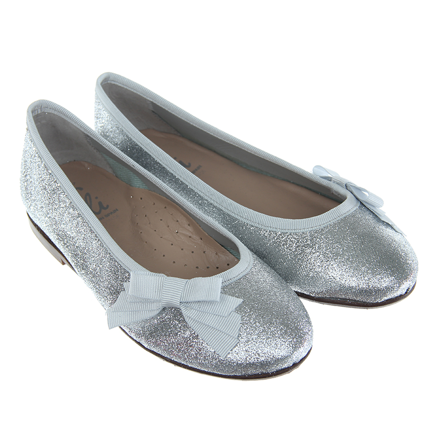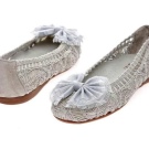 - bright and fashionable shoes with a rounded toe of shining silver textiles with small bows on the sides;
