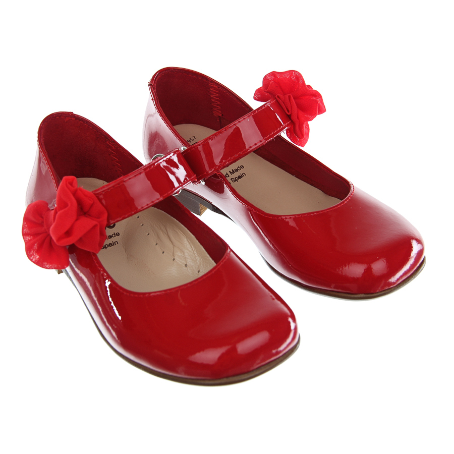 - scarlet and black patent leather shoes with a rounded toe and a decorative flower on a strap in the area of lifting the legs;