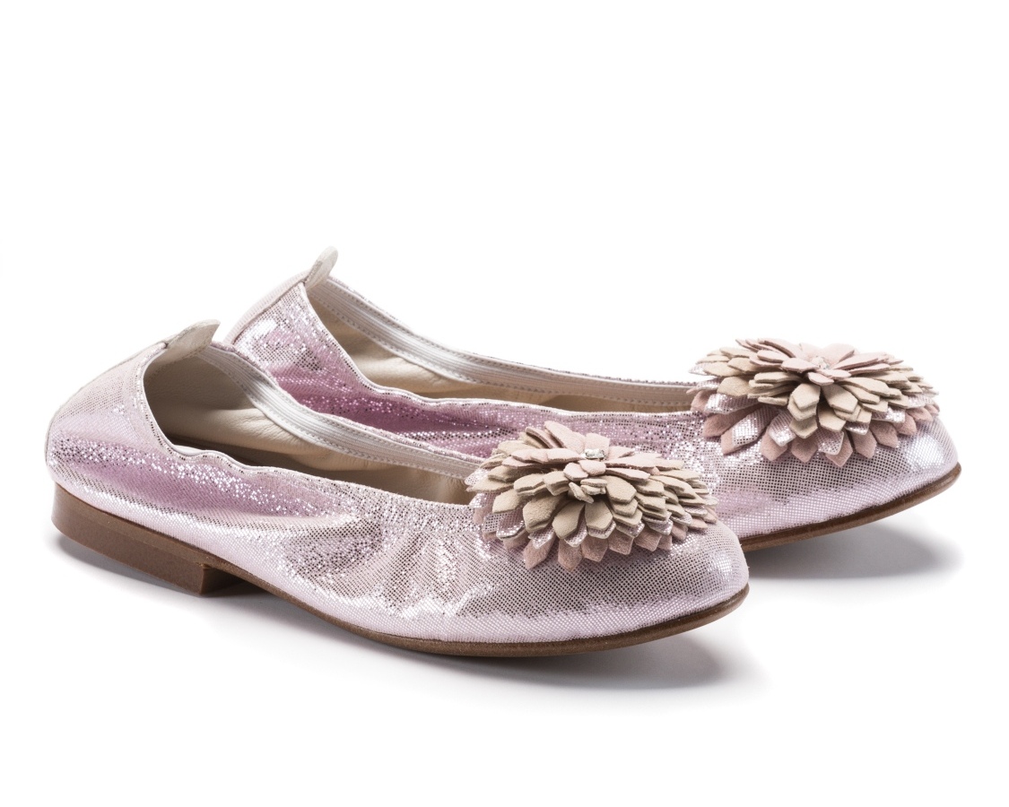 - festive slippers of shiny leather with a jumper on the rise and a large flower appliqué on the toe;