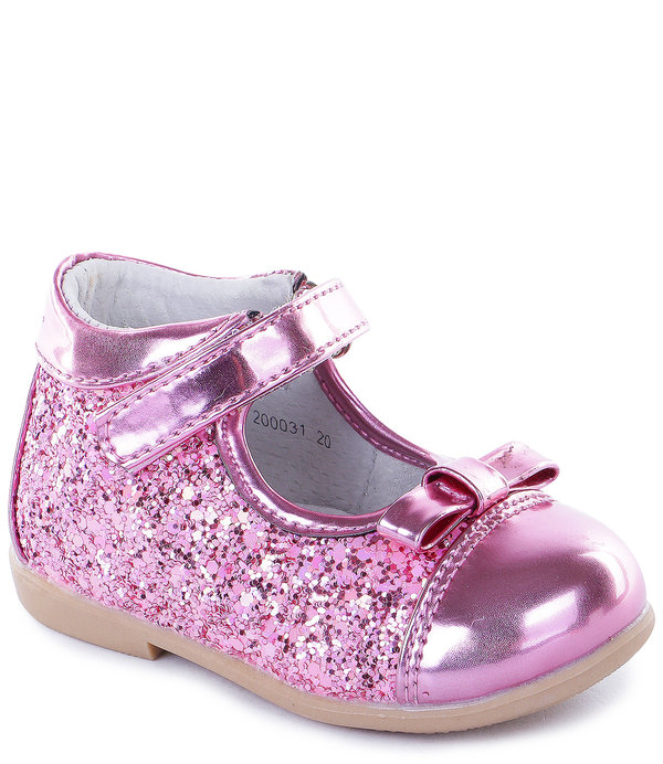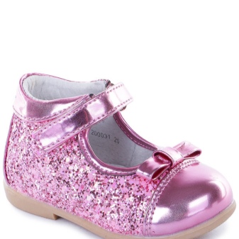 Original models of shoes for little girls with sequined surface possess a very catchy design. Such products have a backdrop, toe and velcro strap from patent leather. The front part is complemented by a small leather bow. Such saturated shoes are perfect for a holiday or a matinee in kindergarten.