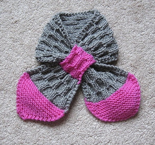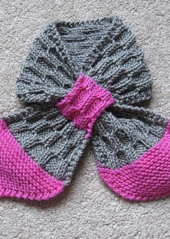 No less popular among the small fans of fashion is the original scarf-bow. Structurally, it is a scarf that has a loop at one end, into which a free end is passed. Such a crossing forms a type of bow. Often this model is made of different materials in structure, in bright contrasting color combinations. The scarf-bow perfectly warms the neck and chest due to the crossed ends, protecting babies from wind and hypothermia.
