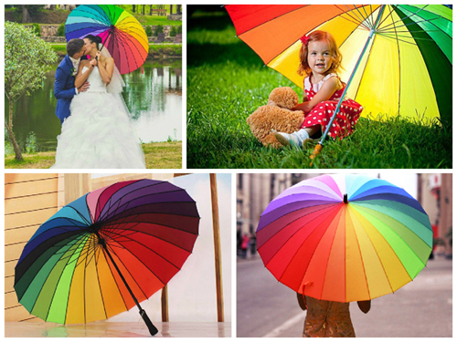 Performed in various colors and combinations. For example, a monophonic umbrella is equally well suited for a little fashionista, and for a girl of 10 years and older. The color can be restrained - black, navy, burgundy, green or rainbow, bright - yellow, orange, crimson, pink, turquoise.