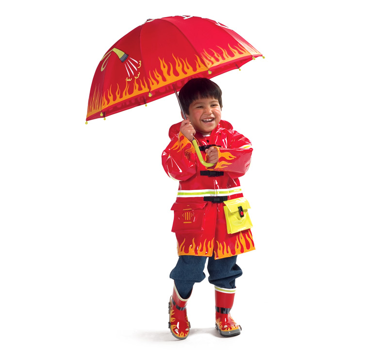This young fireman! The stylish umbrella with a high dome is made of dense waterproof material, decorated in a “hot” red-orange tones and decorated with a characteristic print. The raincoat and rubber boots, which are designed exactly in accordance with the given theme, help to make the image more recognizable and harmonious.