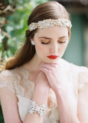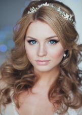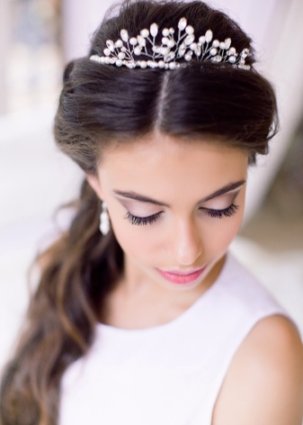 A gentle tiara, complemented with rhinestones, will never lose its relevance. Very effectively, it will look with similar crystals on her hair. To create a harmonious image it is worth picking up a dress and a tiara that will be decorated with identical stones.