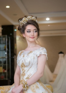 If the tiara is supplemented with rhinestones, then similar crystals should be on the dress. The feminine dress of the fitting cut will be effectively combined with a diadem decorated with various ornaments or simple lines. A bridesmaid dress with crystals and pearls will look amazing in an ensemble with a silver accessory. The dress of the popular color ivory will decorate the golden model. The set of champagne color will be perfectly combined with a golden tiara, complemented with pearl elements.