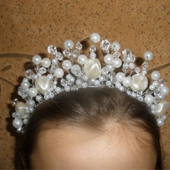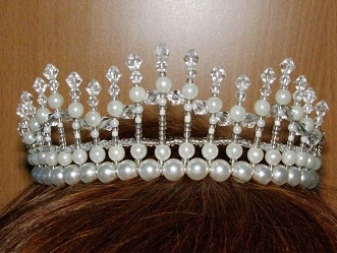 Products with beads look no less impressive and original. They are cheaper than other options, but look no worse. This tiara can be made independently, hitting the guests with their skills.