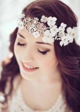 A flirty tiara, adorned with flowers, can add romance to the bride. At the peak of popularity are crowns with flowers. They are perfect for a wedding dress. The accessory itself can be made of any metal, plastic or textile.