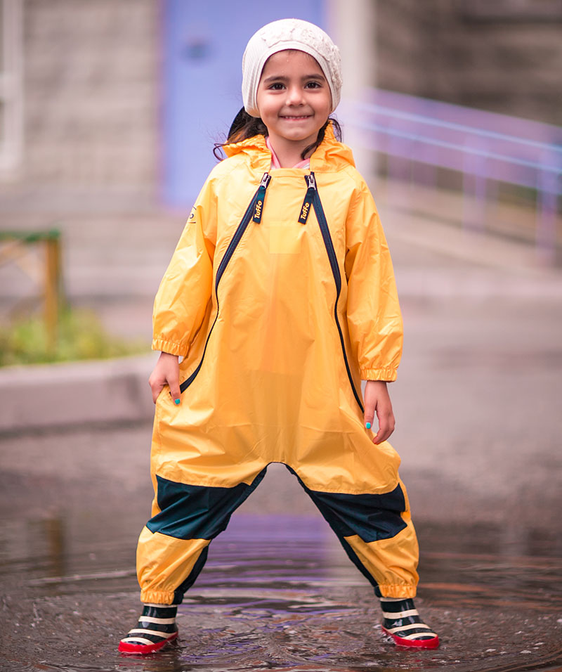 First of all, mothers of children are very pleased with the raincoats of the “jumpsuit” format. According to them, this is an indispensable thing for playing in the courtyard, traveling outside the city or to the village. The closed jumpsuit allows you not to worry that the baby is wet and cold, and in combination with rubber boots it is just a killer combination for any activity!