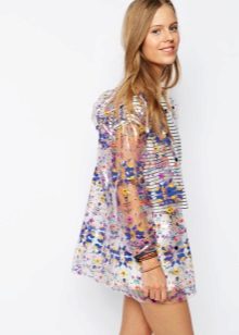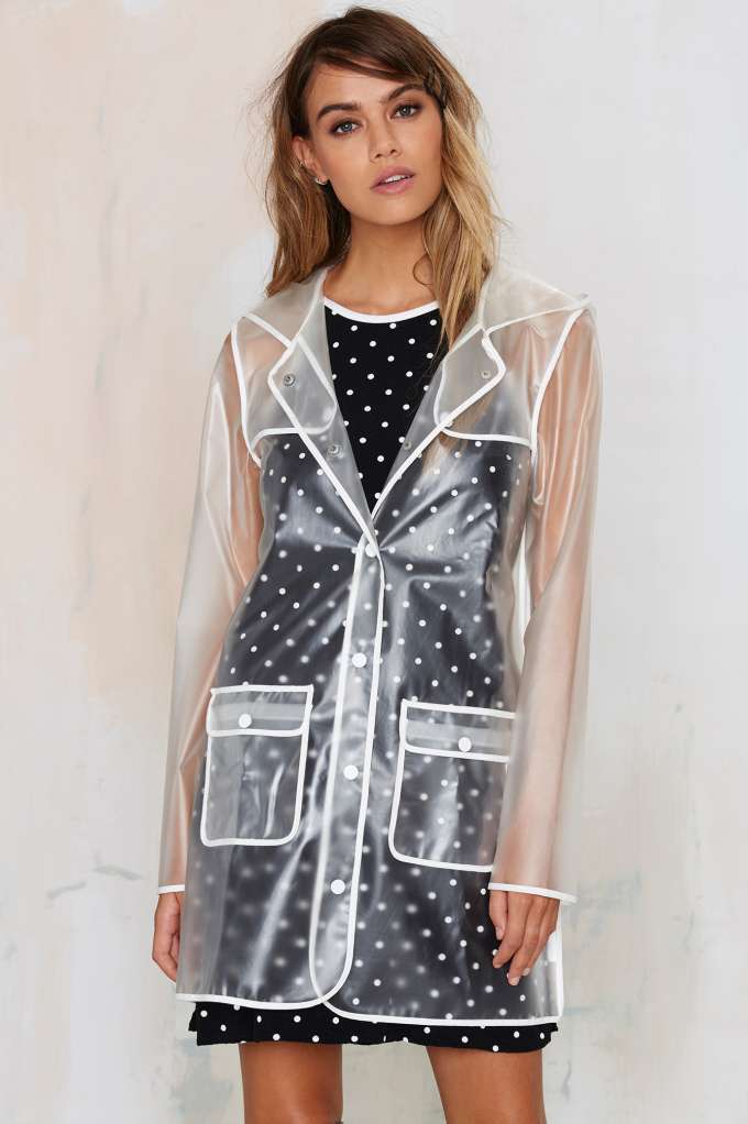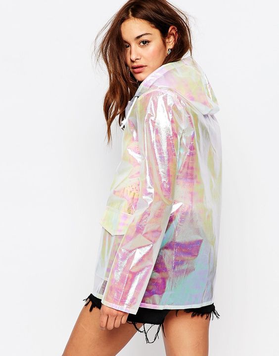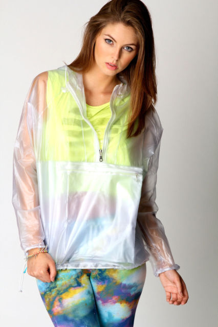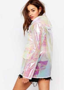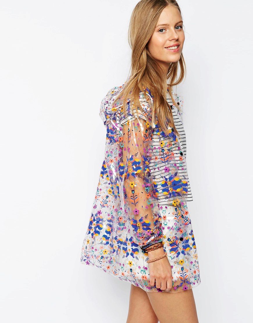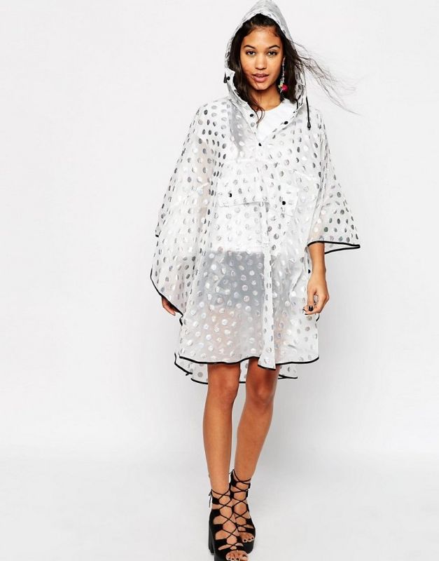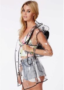 - A short raincoat park is perfect for summer. Especially it will be appropriate at a music festival - if it suddenly rains, you can continue to enjoy the performance of your favorite band. Please note that the raincoat needs to be selected in such a length that all clothes are securely hidden. In this case, a good choice of short shorts and a basic white T-shirt. The image is complemented with bracelets, baubles and a wreath on the head.