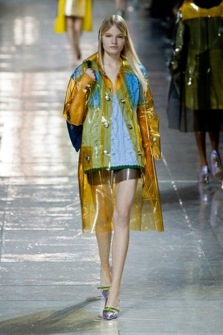 - Another great choice for rainy autumn days. Designers like to experiment, so this season they offer us not only the outerwear of their polyethylene, but also hats, jackets and even skirts, as in this case. A pair of warm blue sweater with green trim. The image is complemented by a bright yellow raincoat and lilac boats. Stylish eclectic for every day and for a special occasion.