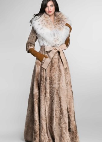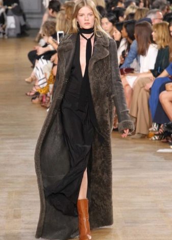 Outerwear to the floor, certainly the leading trend. Women's coats are no exception. Long to toe and closing shoes, they allow you to diversify the image of accessories and place accents. Long scarves and stoles will be combined with sheepskin coats in the floor. Unlike a fur coat, to a sheepskin coat it will be possible to pick up a headdress of any texture and style.