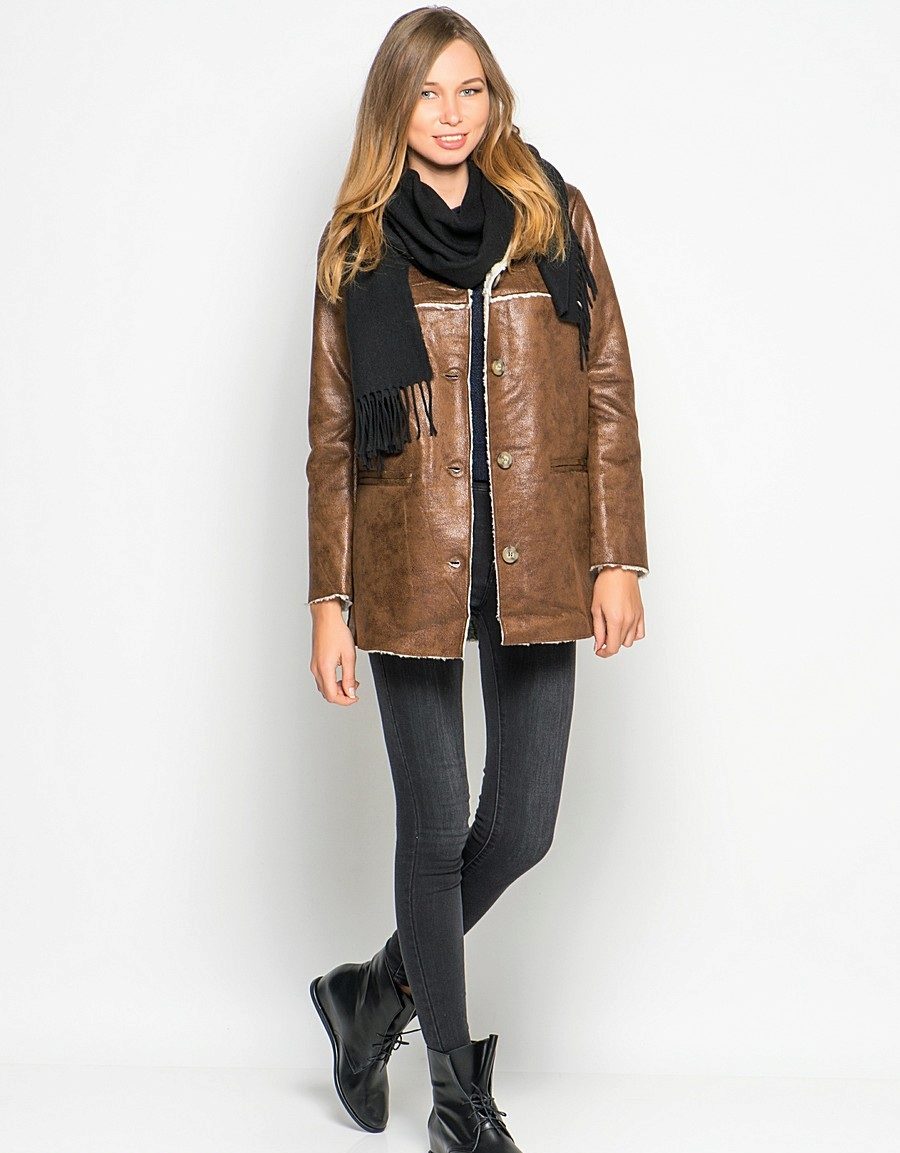 Warm, slightly flared trousers, jeans and leggings work well for a short faux sheepskin coat. Its tandem with a volume scarf (snood) or a modern shawl will look great. Boots must have high tops. You can also choose neat ankle boots.