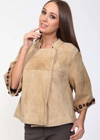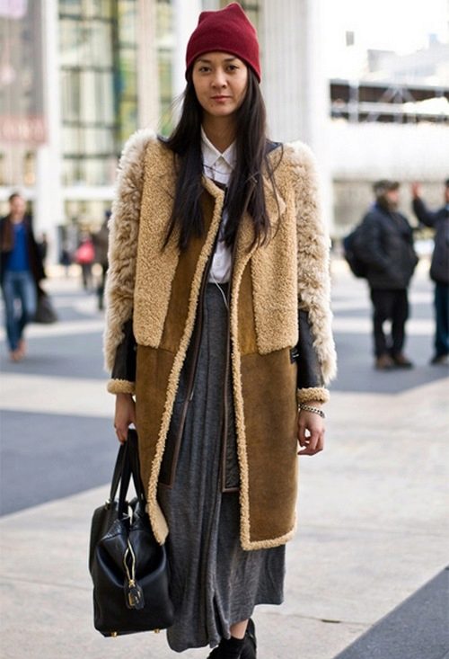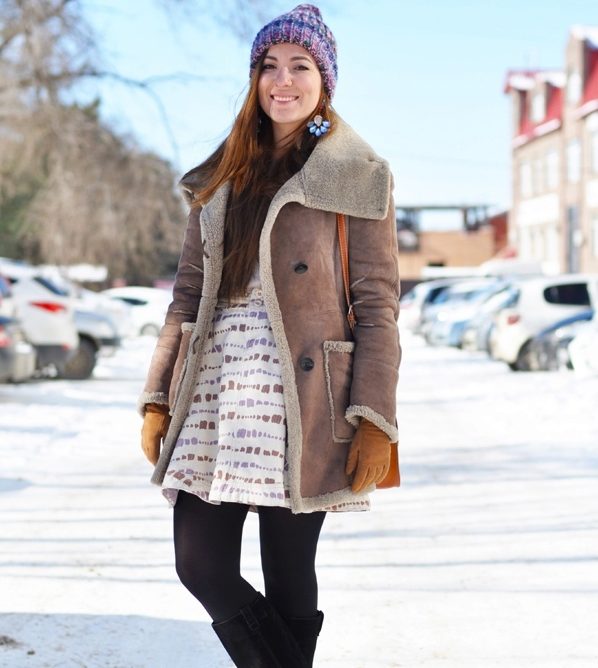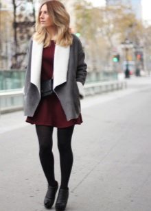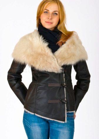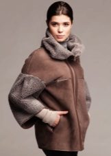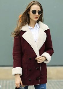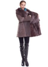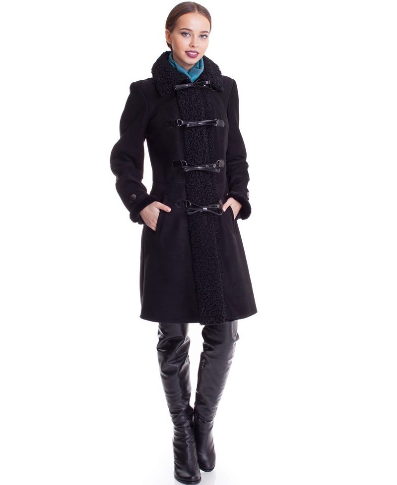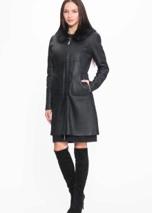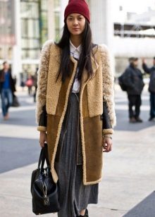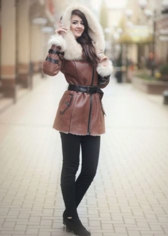 A short model will look stylish with a dress of classic style and high boots. With a sheepskin coat of such length it will also be appropriate to wear a long sweater that will be visible from under the outerwear.