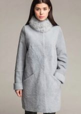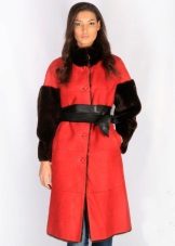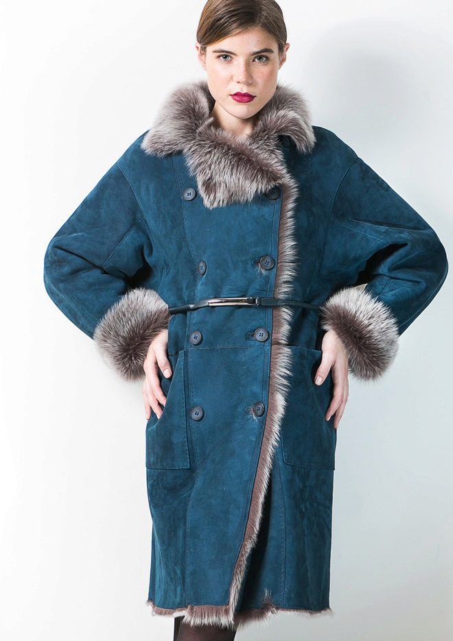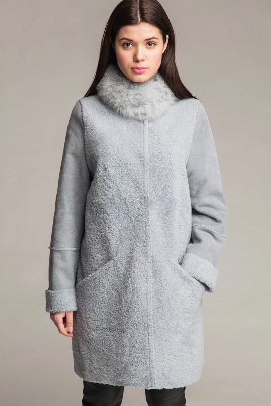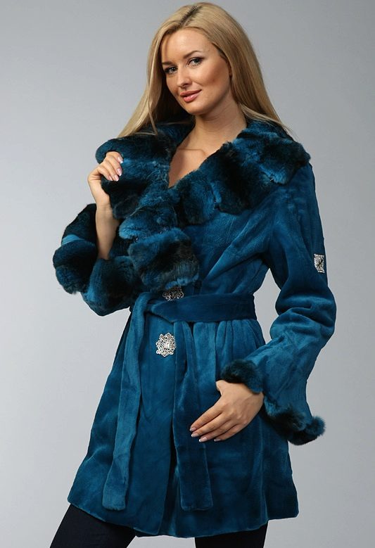 Another unique and luxurious Italian model of a fashionable shade of blue, which is especially to the face of blondes. The material of the sheepskin coat looks incredibly soft and soft, as if flowing in the shape of beautiful folds. Again, the original shawl collar, this time with a smell and having an uneven edge. The wide belt emphasizes the thin waist of the girl, and flared sleeves, trimmed with fur, reveal graceful wrists. The decoration of the model are large buttons, similar to silver snowflakes.