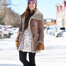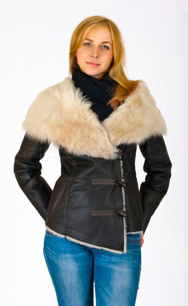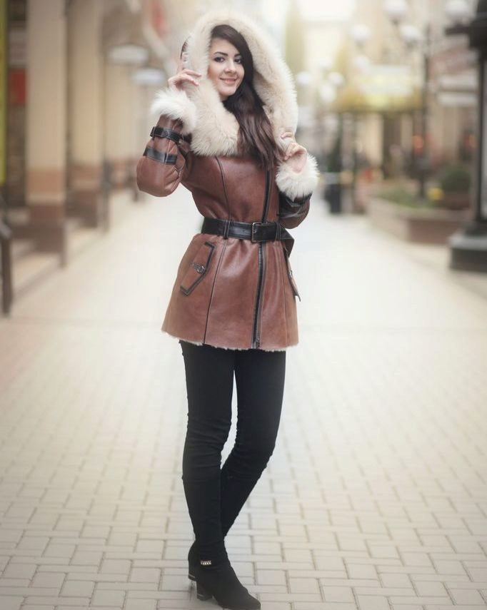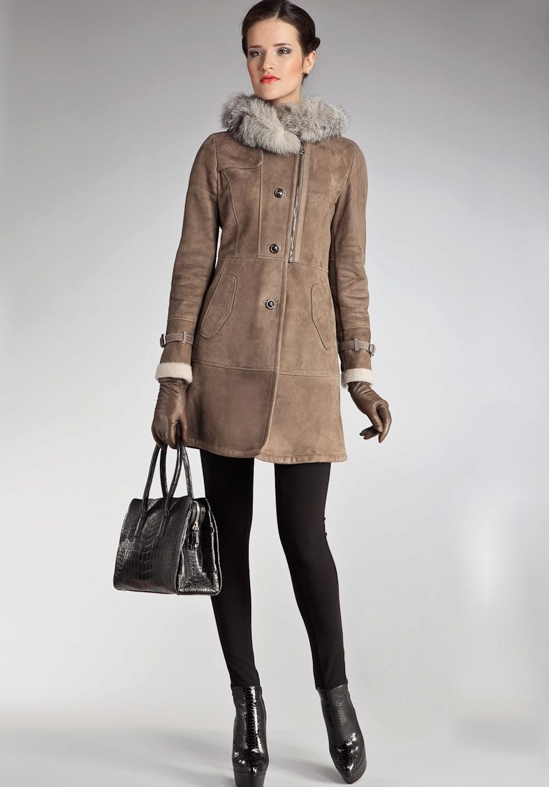 Laconic and elegant option. Shortened slightly fitted sheepskin coat to the middle of the thigh of a beautiful light brown color suitable brunette with her strict hair and discreet makeup. A neat fur collar harmoniously complements the product, and the highlight of the model is asymmetrical stitching and zipper. Sheepskin coat is successfully combined with black leggings, as well as a bag and ankle boots of shiny leather. The successful solution is gloves of the same color with outer clothing.