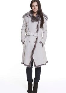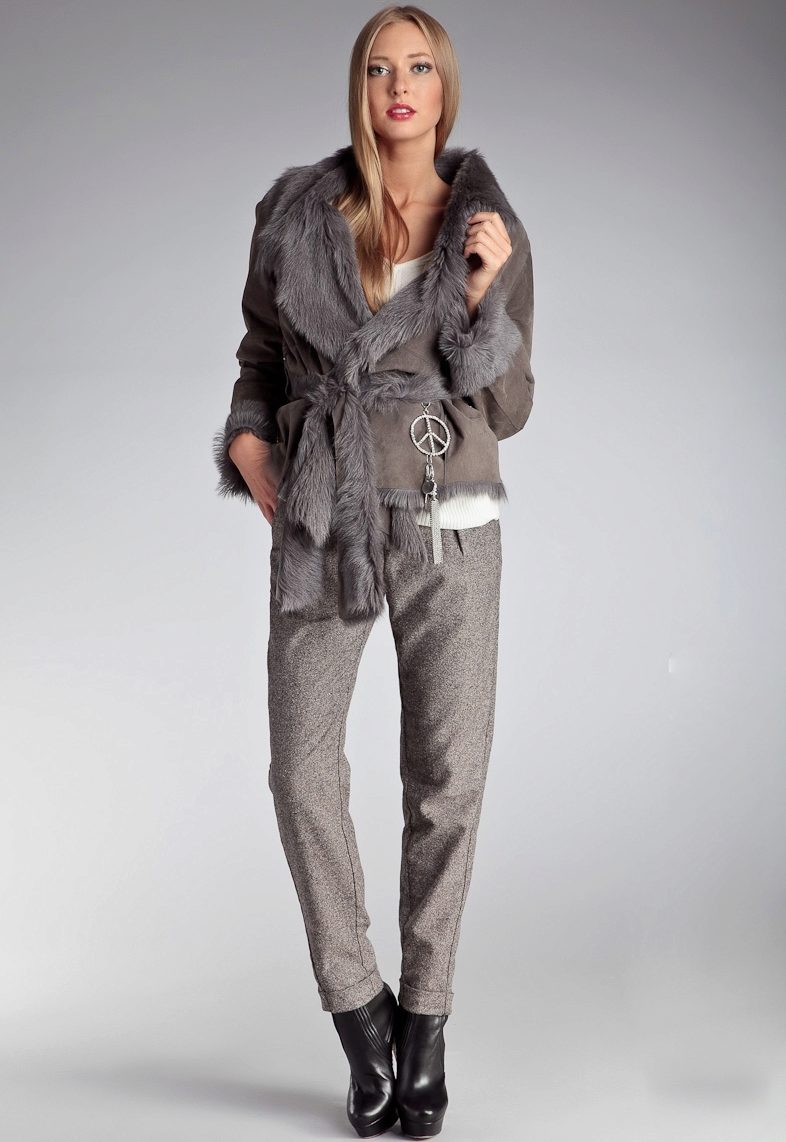 Incredibly stylish short Italian sheepskin coat looks particularly fashionable in light gray. Suede in combination with trimmed from short-haired natural fur looks luxurious. The highlight of the image is a wide shawl collar, starting from the chest itself and a long fur belt (felt by the hand of Italian designers).