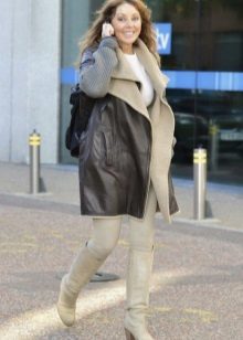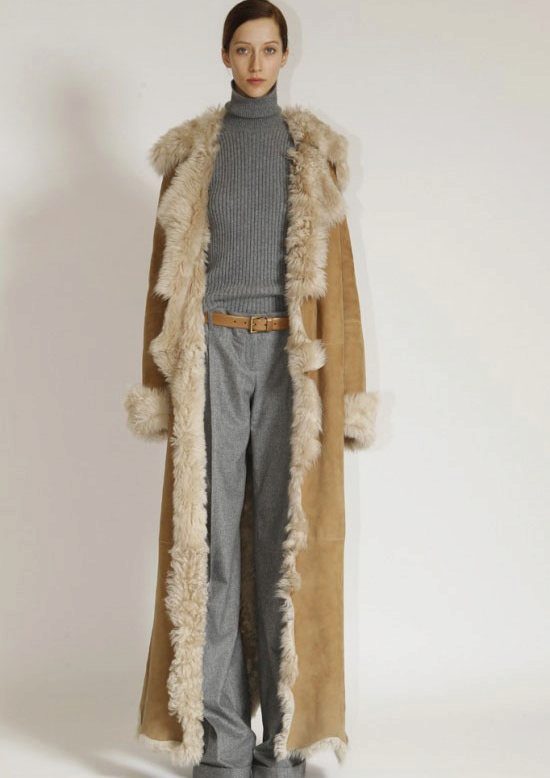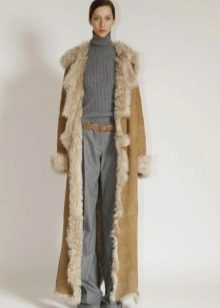 The ideal addition to the Italian sheepskin coat will be narrow trousers, close to her in tone, and a fitted pullover or turtleneck.