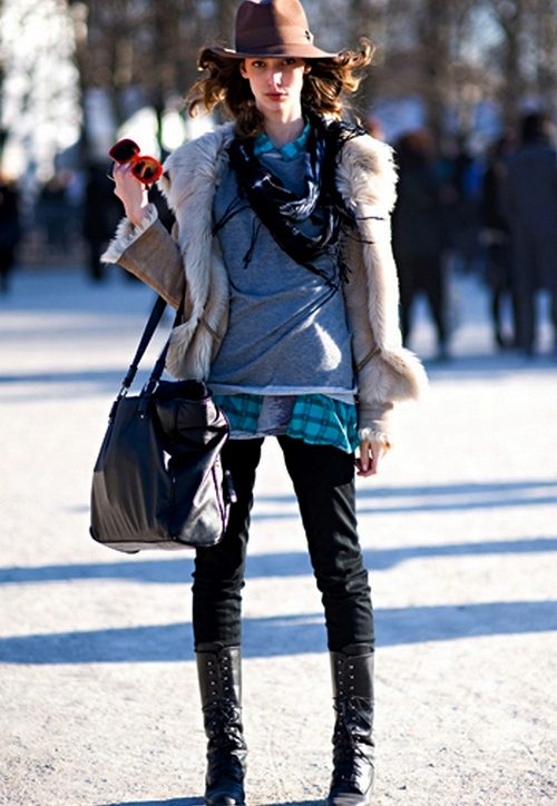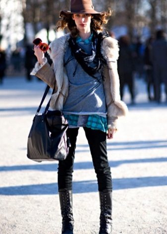 The rest of the wardrobe items are in complete harmony with the outerwear: a knitted white blouse, opening chest, trousers of the fashionable style narrowed to the bottom are lighter than sheepskin and black boots with thick soles and high heels that make the legs even slimmer. The result is a stylish image of a young girl who knows the value of herself and beautiful things.