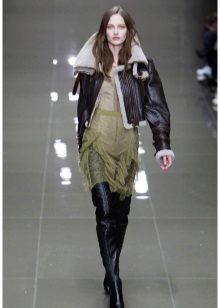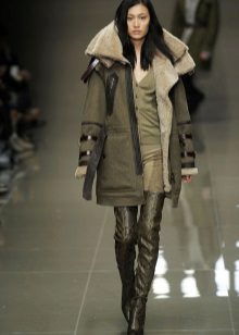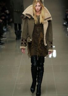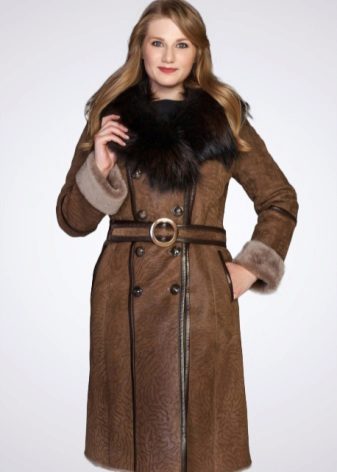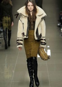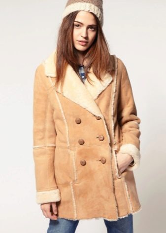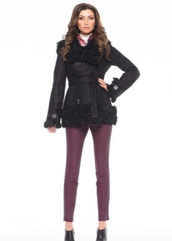 A special place is occupied by sheepskin coats in a military style such as a pea coat, uniform or coat, characterized by a double-breasted collar. additional decoration in the form of epaulettes, loops, stripes. These models can be straight cut or slightly flared from the belt.