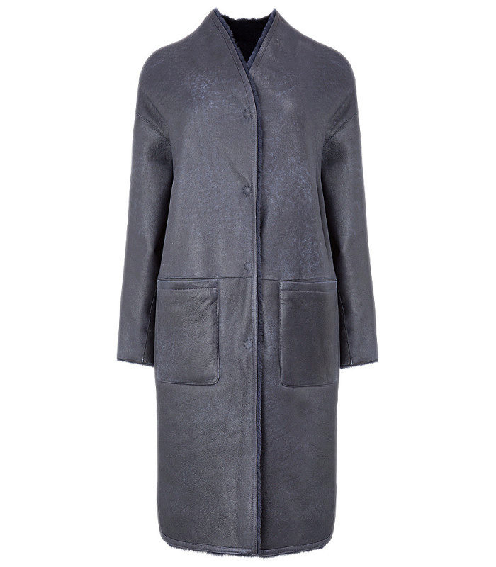 Incredibly fashionable sheepskin coat straight cut keeps another secret - a two-way model. And if one side is made in “leather” version with a minimum of details in a beautiful gray color, then the other side will appreciate the unusual “fur” type of sapphire color, and the same cut details look like a new model. Sheepskin coat of straight cut, medium length, without a collar with a V-shaped neckline in the form of a stand, with buttons with a long sleeve and a belt. The sleeve line is slightly lowered, which in combination with the neck looks very harmonious.Overhead volumetric pockets of a clear geometric shape give the model a trendy look. Fur patch pockets are made of sheepskin with a long nap and a different color - gray.