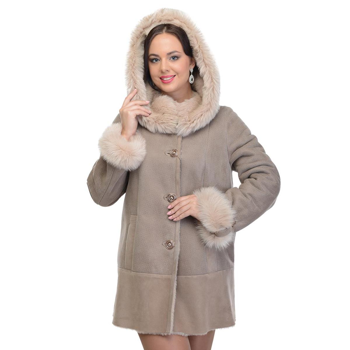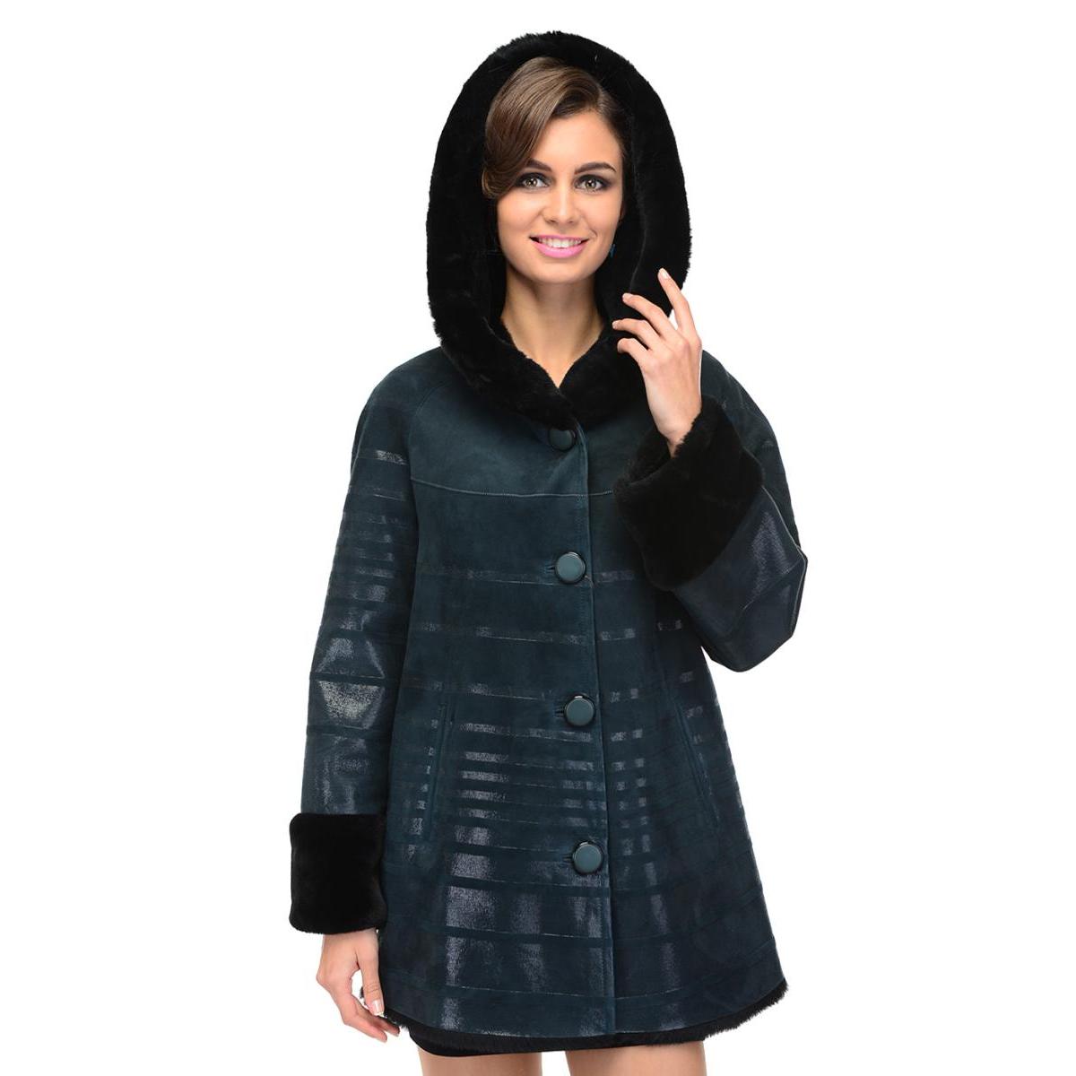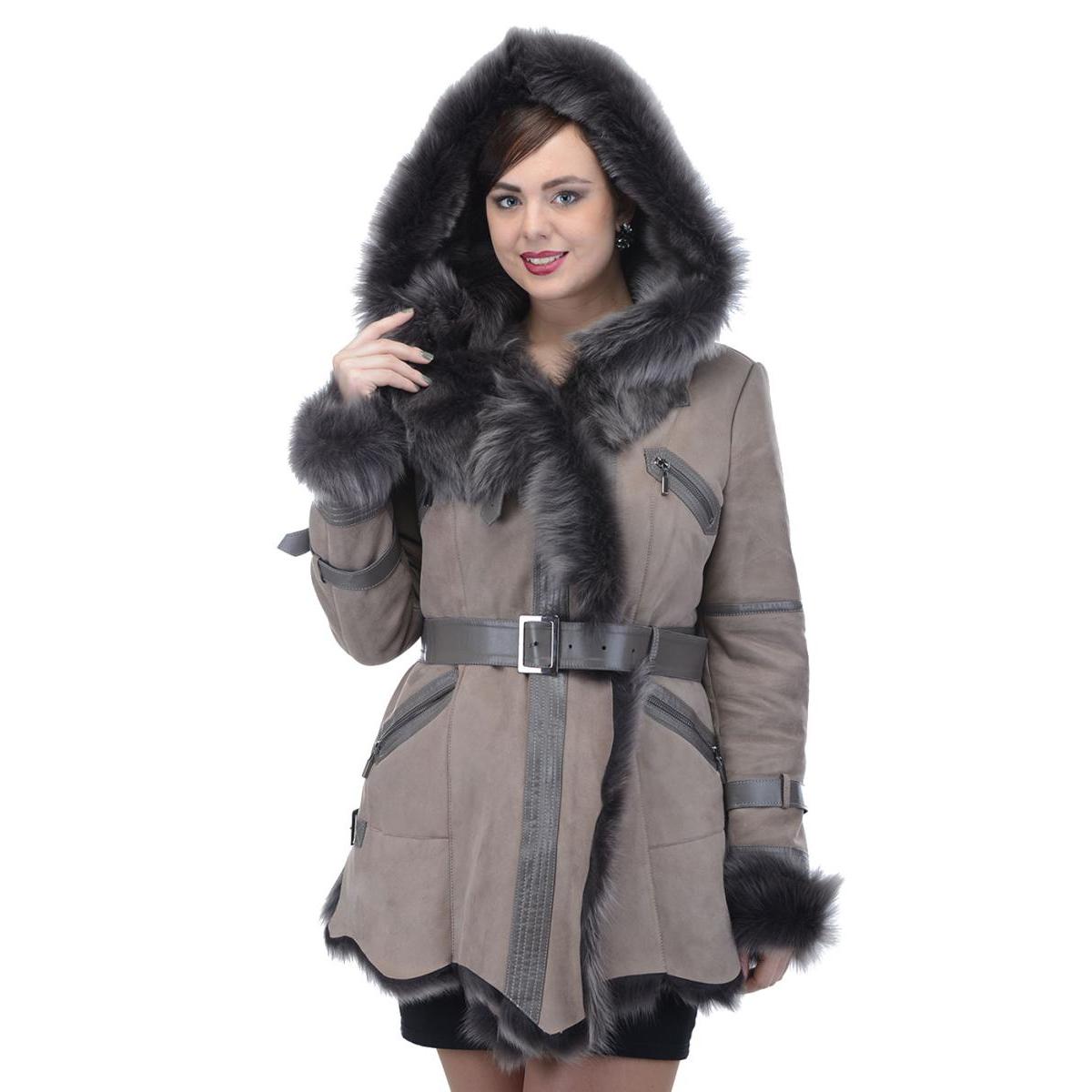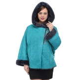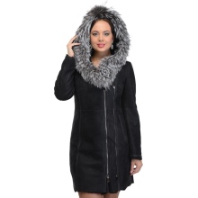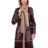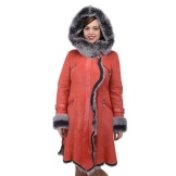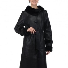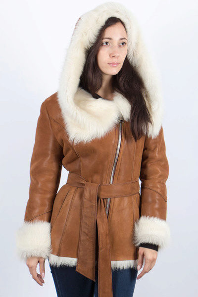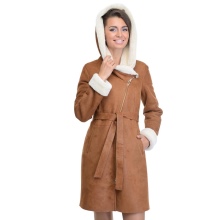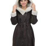 Loose trapezoid sheepskin with length to mid-thigh fit any figure, emphasizing the femininity of the silhouette. Often the model complement the hood with fur trim, which is also present on the sleeves.