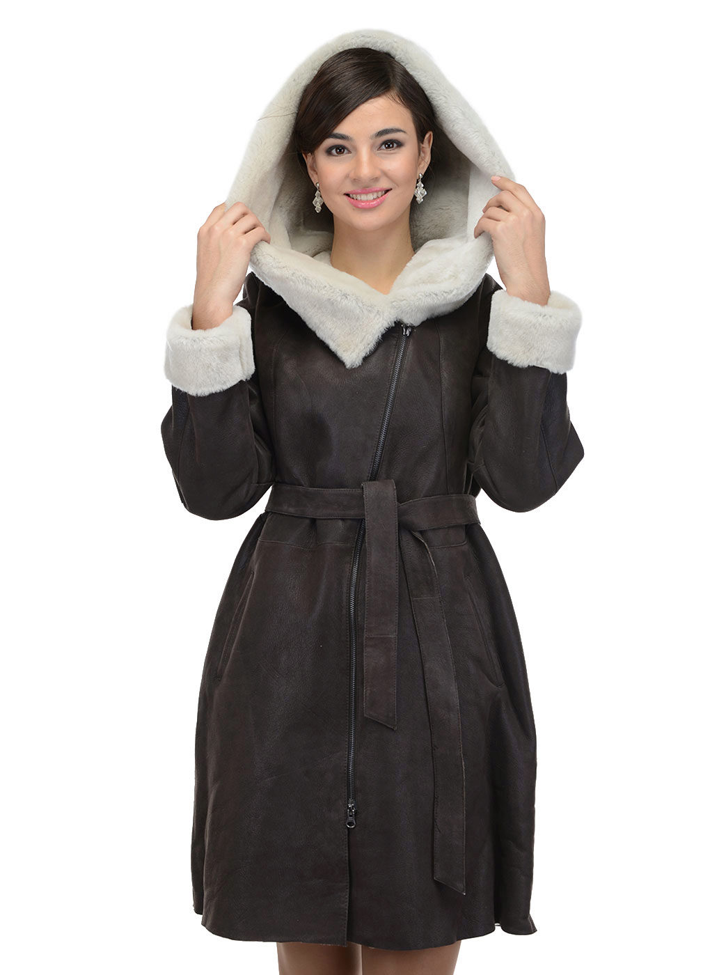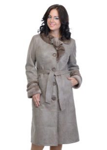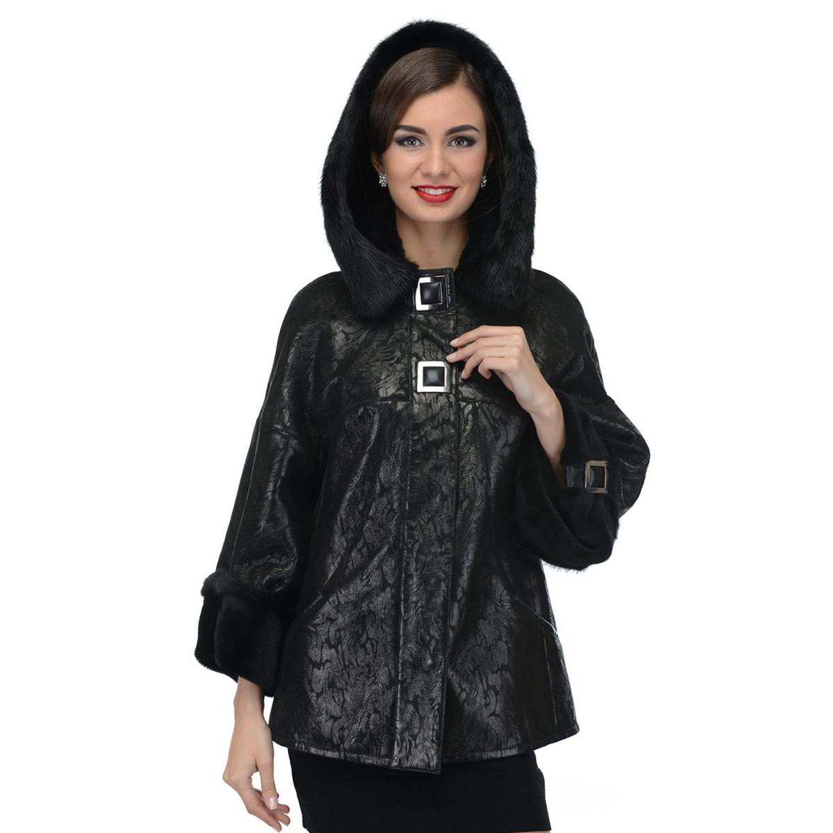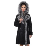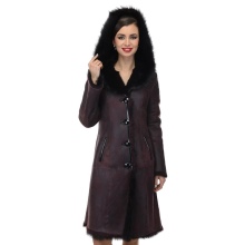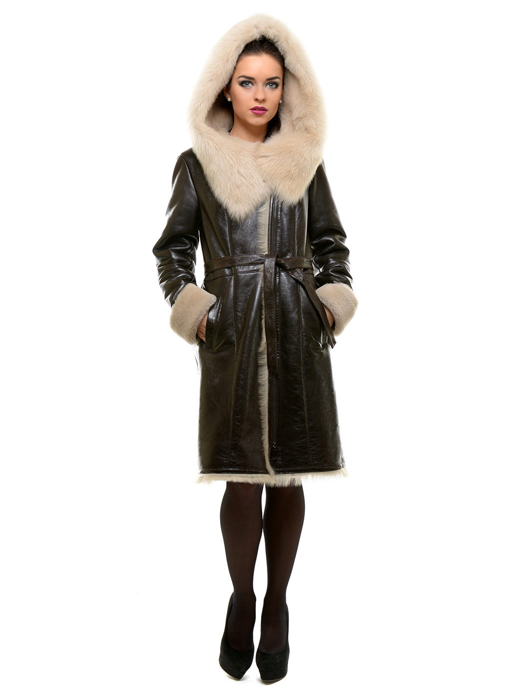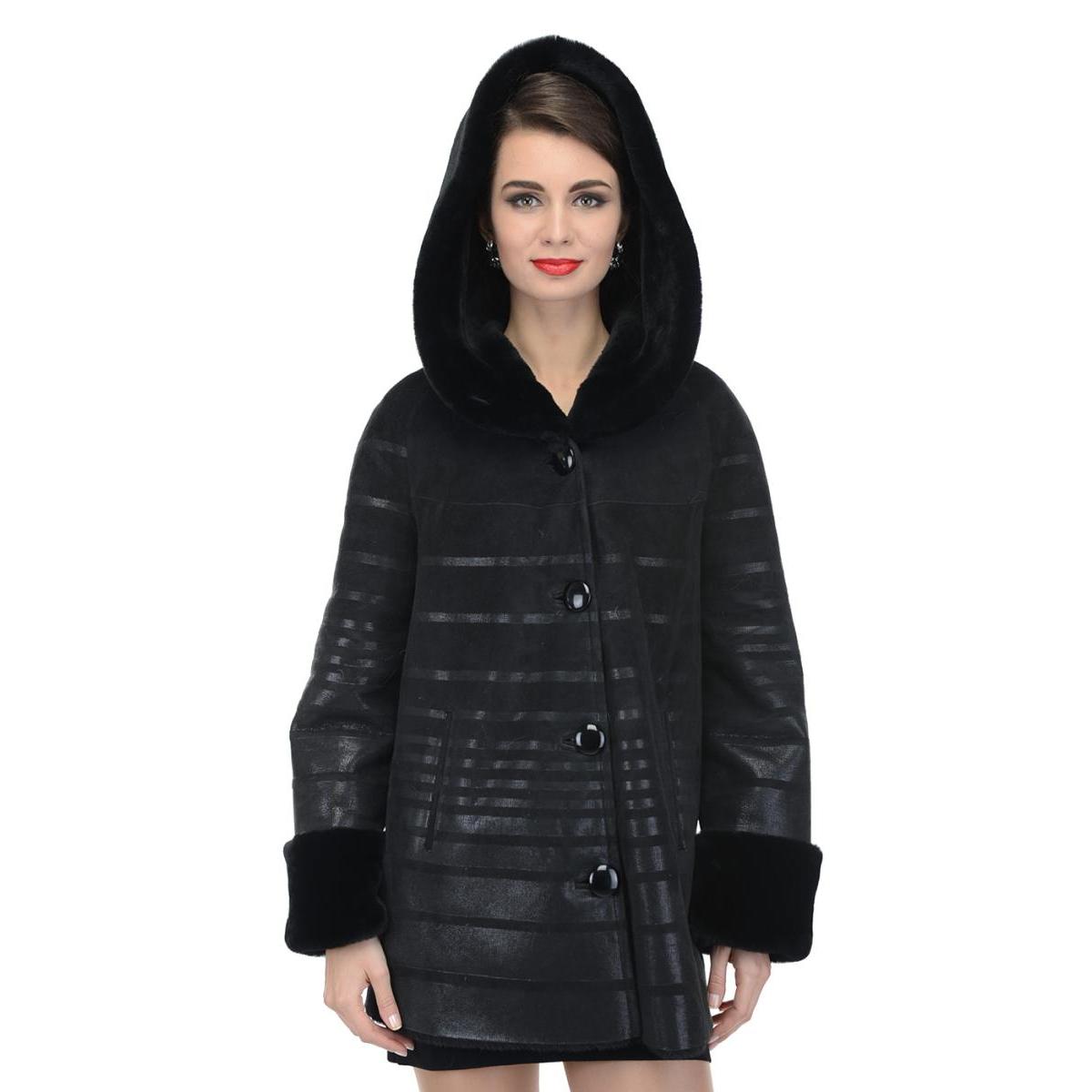 Loose trapezoid sheepskin with length to mid-thigh fit any figure, emphasizing the femininity of the silhouette. Often the model complement the hood with fur trim, which is also present on the sleeves.
