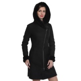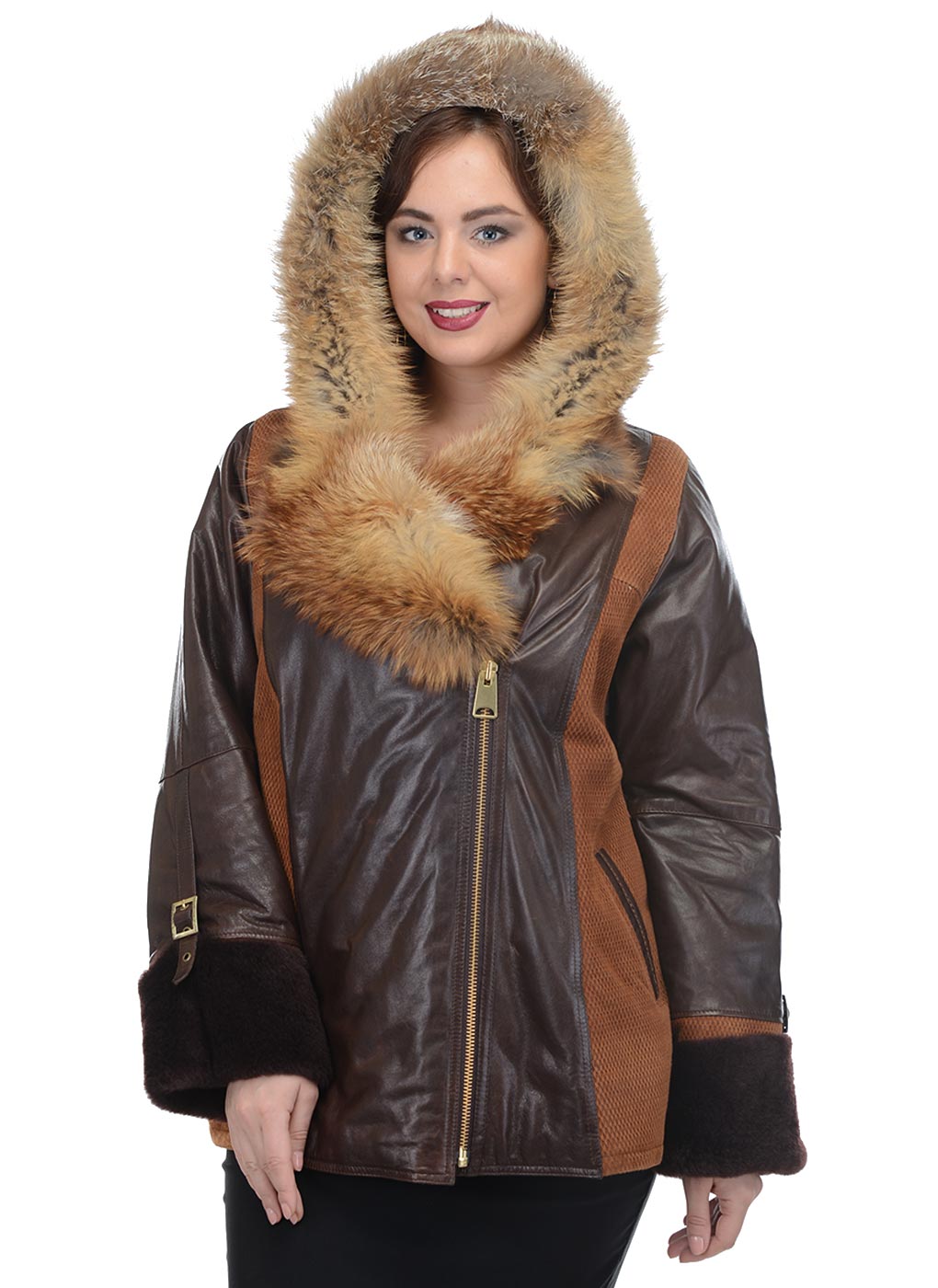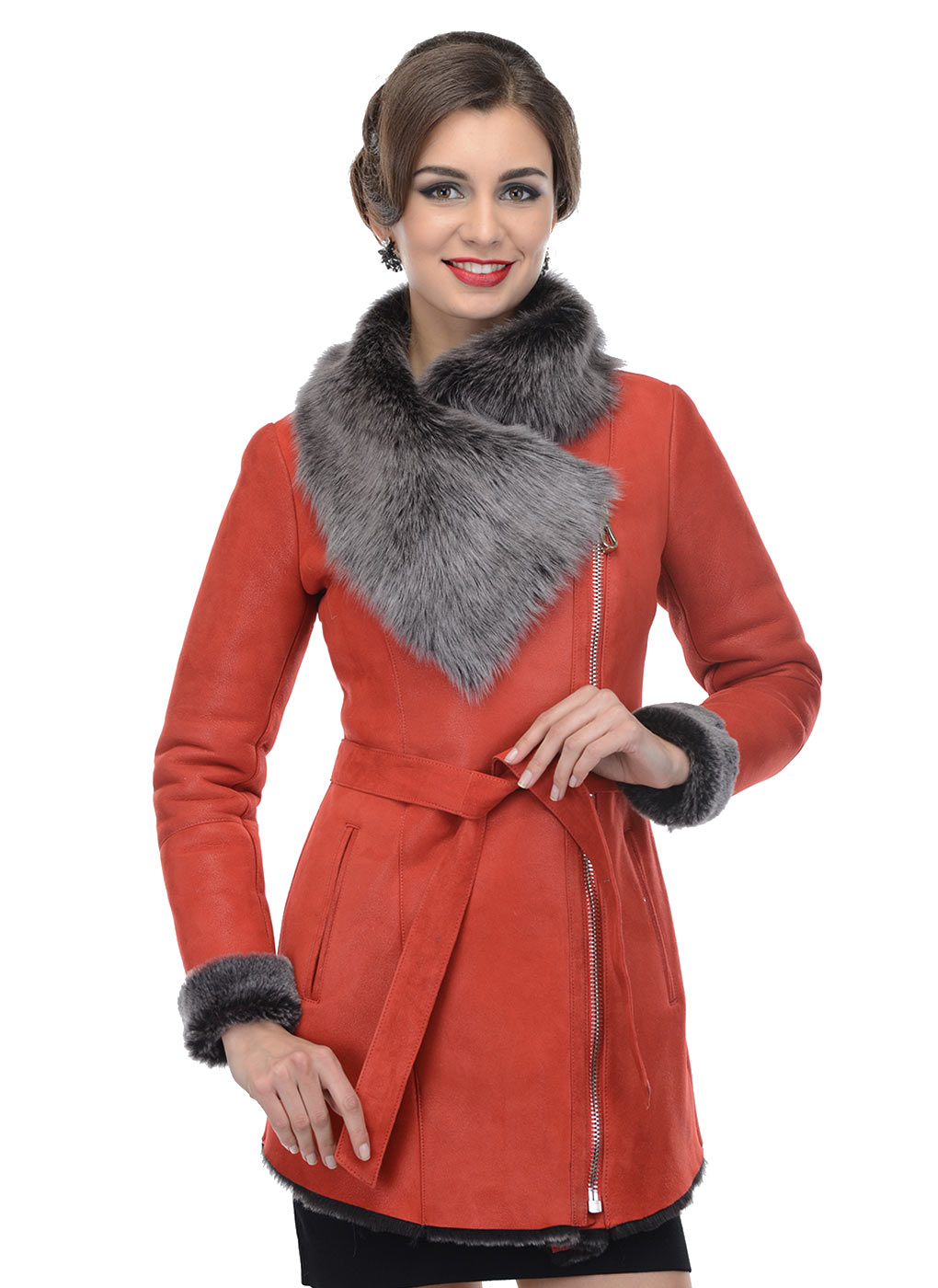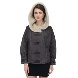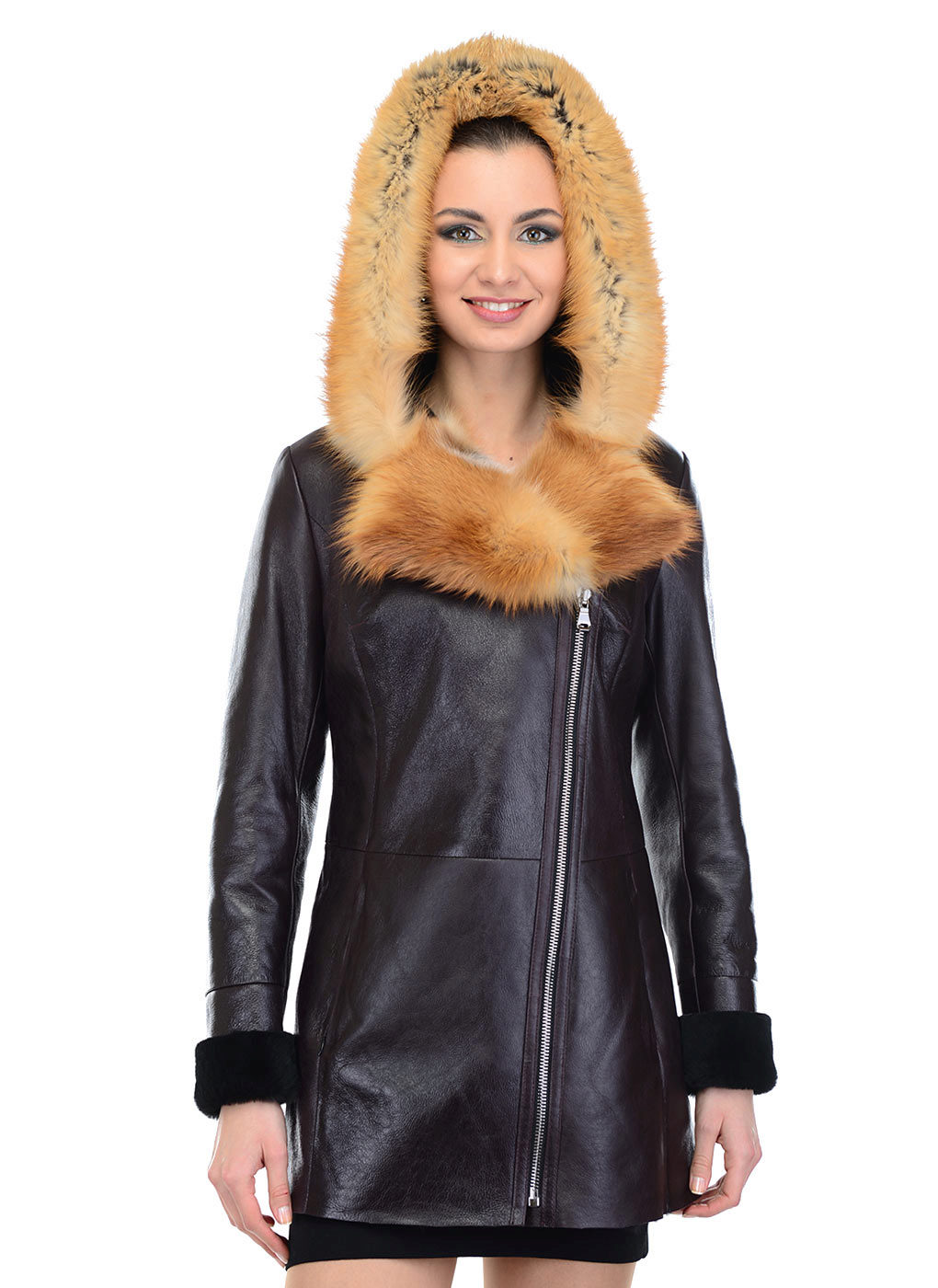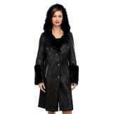 Loose trapezoid sheepskin with length to mid-thigh fit any figure, emphasizing the femininity of the silhouette. Often the model complement the hood with fur trim, which is also present on the sleeves.