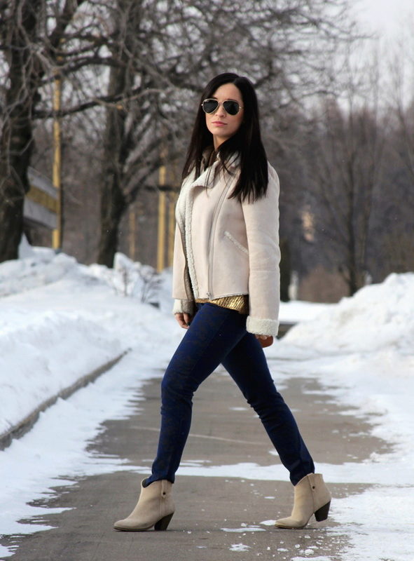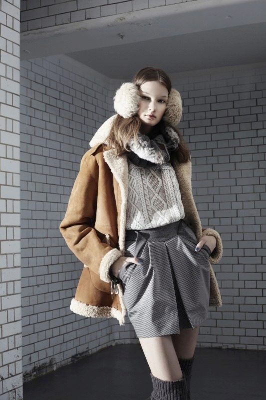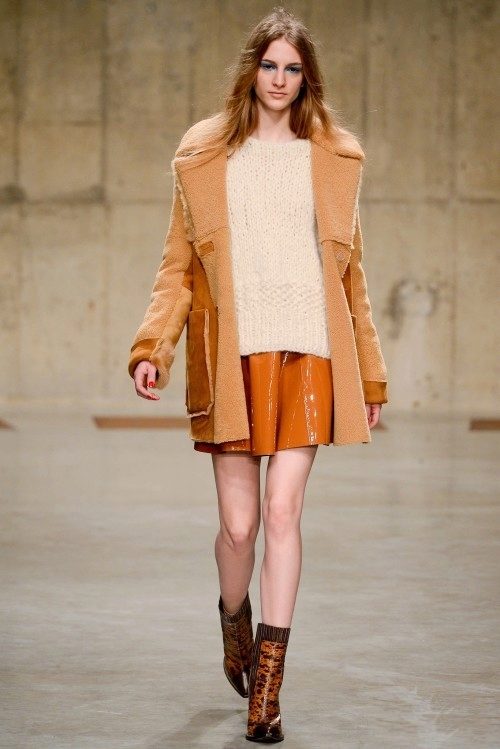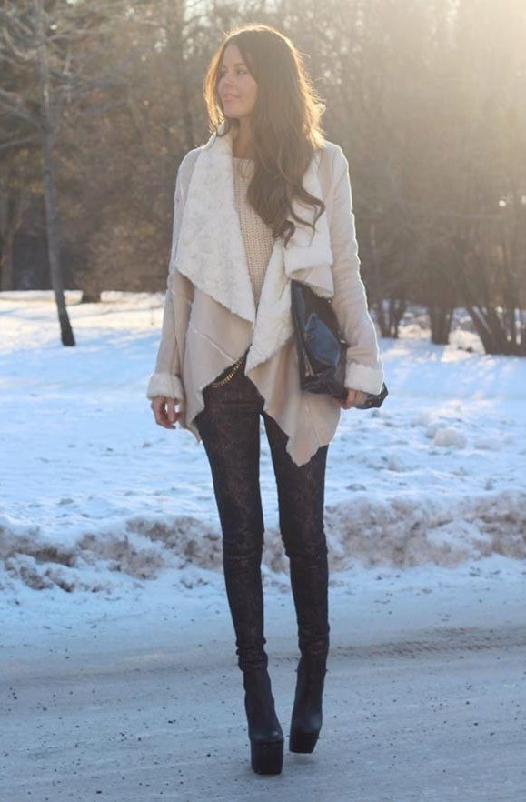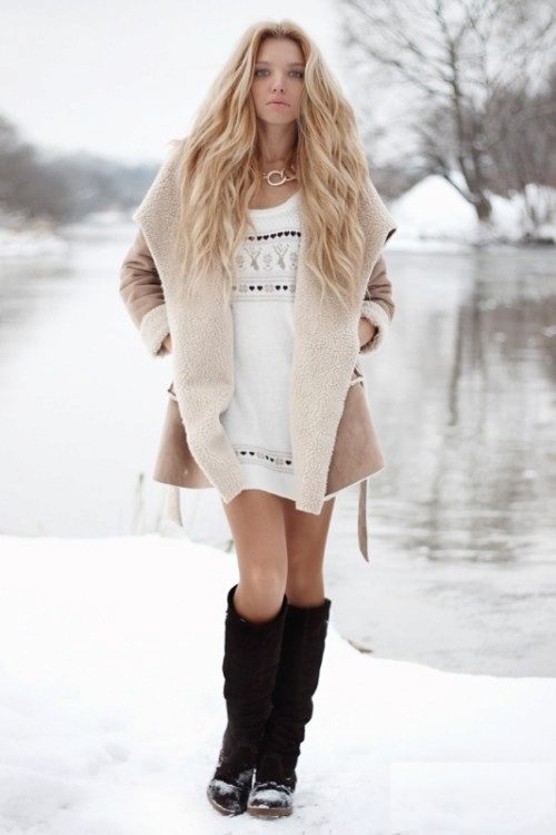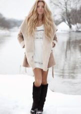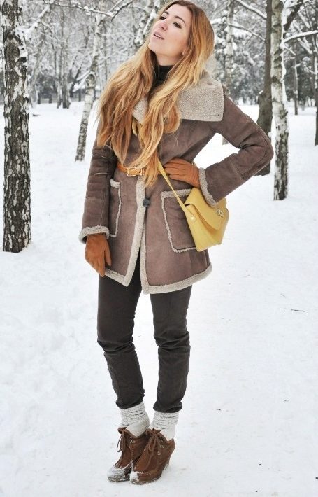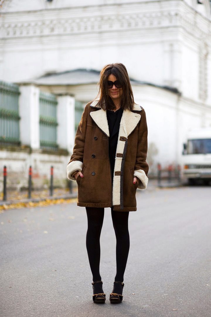Short sheepskin coat looks beautiful in tandem with a dress.