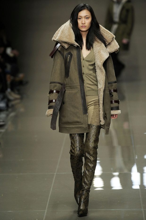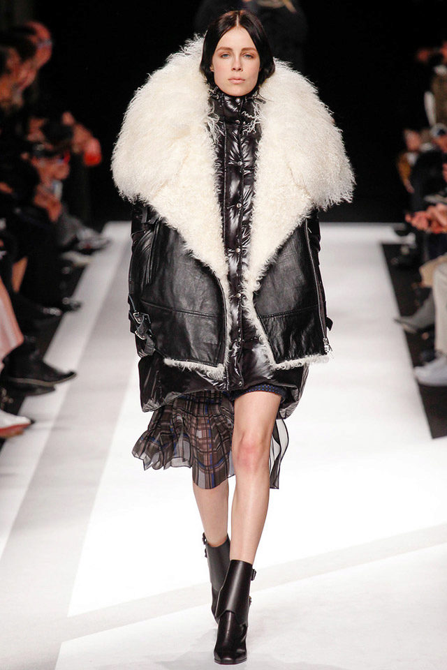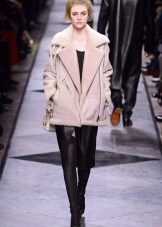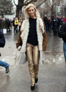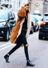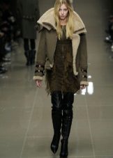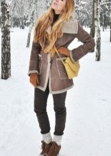 The sheepskin coat with imitation of a jacket over it looks spectacular. An ideal addition to create an image in a grunge style would be shoes, an unusual hairstyle and a backpack on the shoulders. Sheepskin coats in this style can be mini or midi lengths.