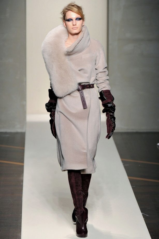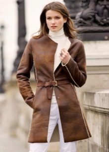 Sheepskin coats with a belt of a contrasting color look beautiful and stylish. They emphasize the waist line, give the silhouette of femininity and charm. Today in trend sheepskin with short sleeves. In the cold season, high gloves will be an excellent addition to the fashionable bow.