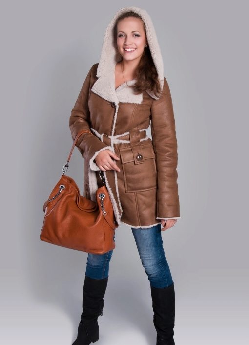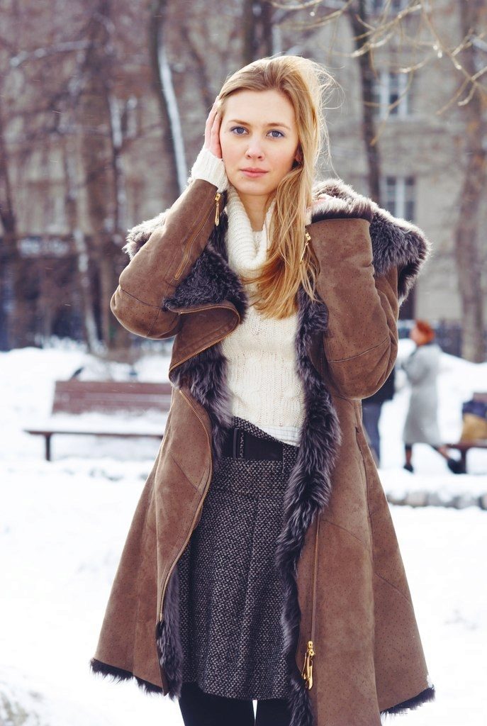 Young girls prefer to wear sheepskin coats with a smell. Usually they are fixed with a belt or a refined clasp. To create a business, elegant bow, a straight cut model with a turn-down collar or a stand-up collar, complemented by fur, is perfect. The sheepskin coats with short sleeves look impressive and glamorous. In the cold season they should be worn with long gloves.