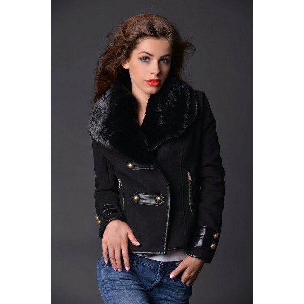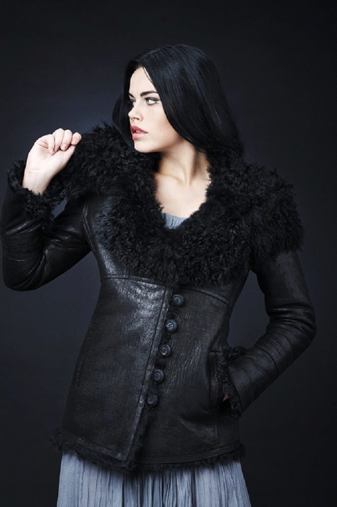 Very stylish youth model of classic black with a lot of trendy details. The luxurious shawl collar from short-haired fur beautifully frames the shoulders and chest of the girl and looks harmoniously with a fitted silhouette. The original element is a diagonal zipper. The original cut has the bottom of a lightweight sheepskin coat - the product is shortened on the sides and extended in front.