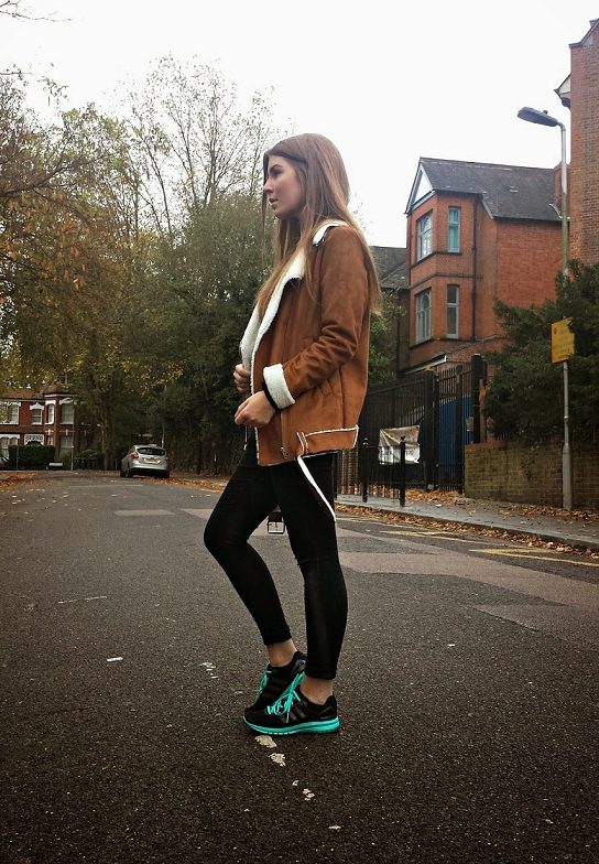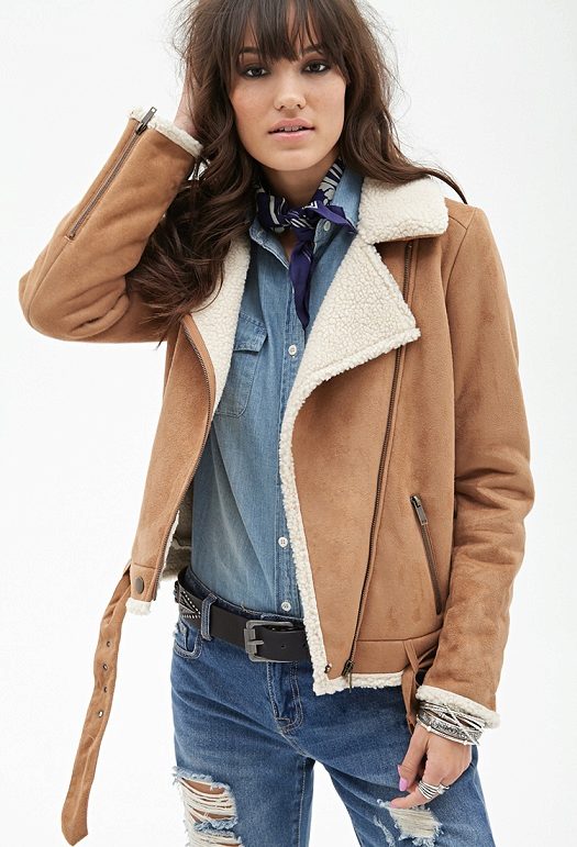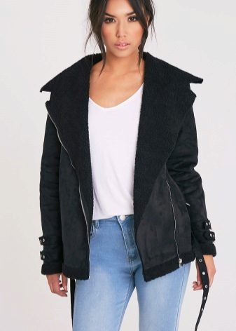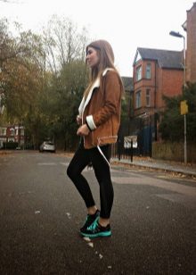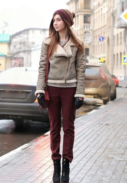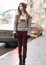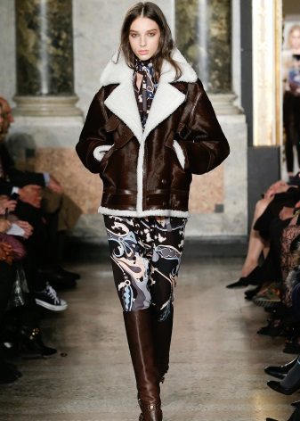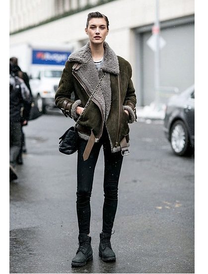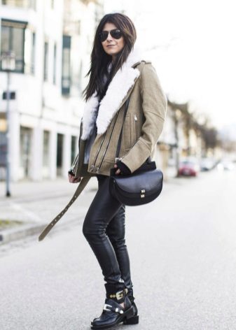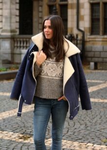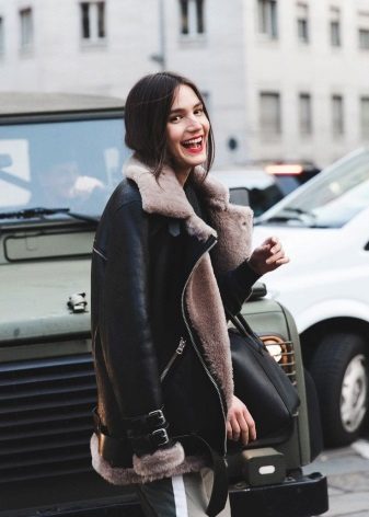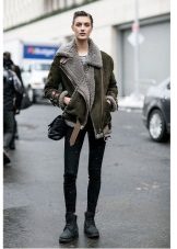 Sheepskin pilot great fit into everyday wardrobe, as it is versatile in combination with other things. The ideal option is high boots or boots with rough soles, skinny jeans and a sweater. In cold weather, you can wear a very warm jacket under a sheepskin coat, tie a voluminous snood around your neck, and dark uggs on your legs. Cozy and comfortable image!