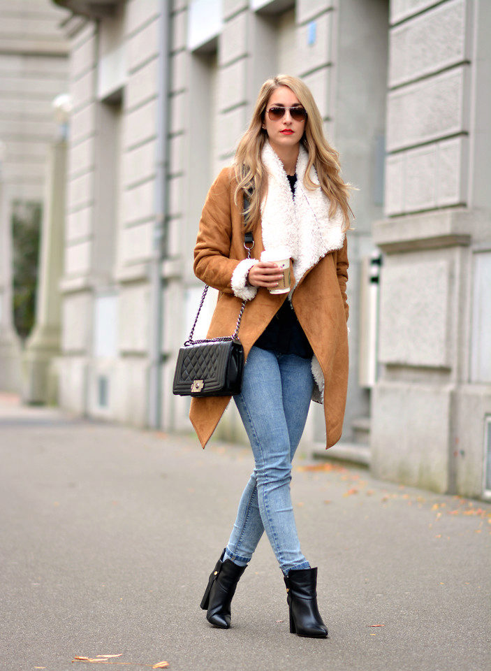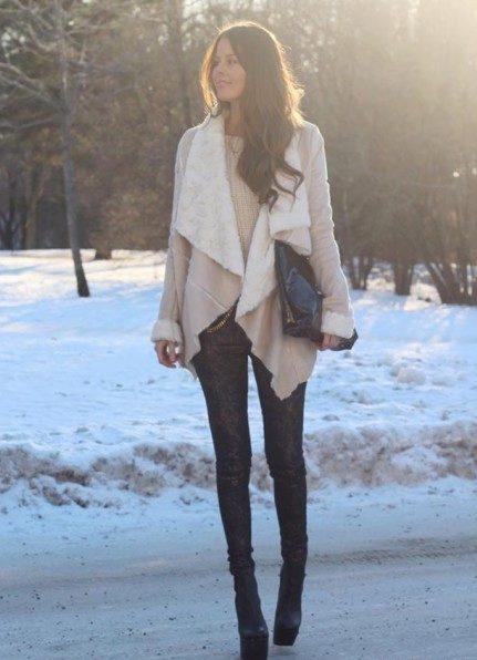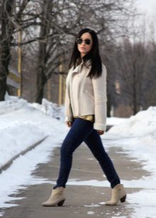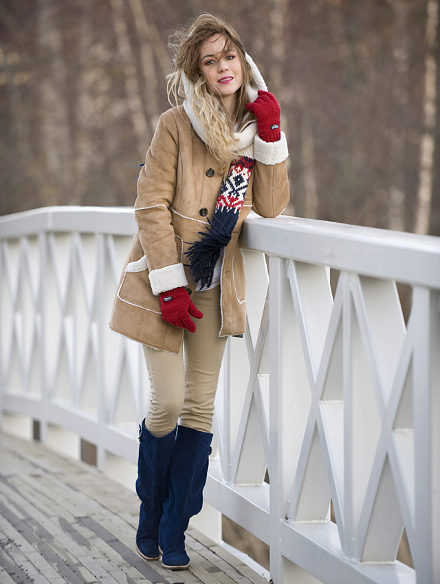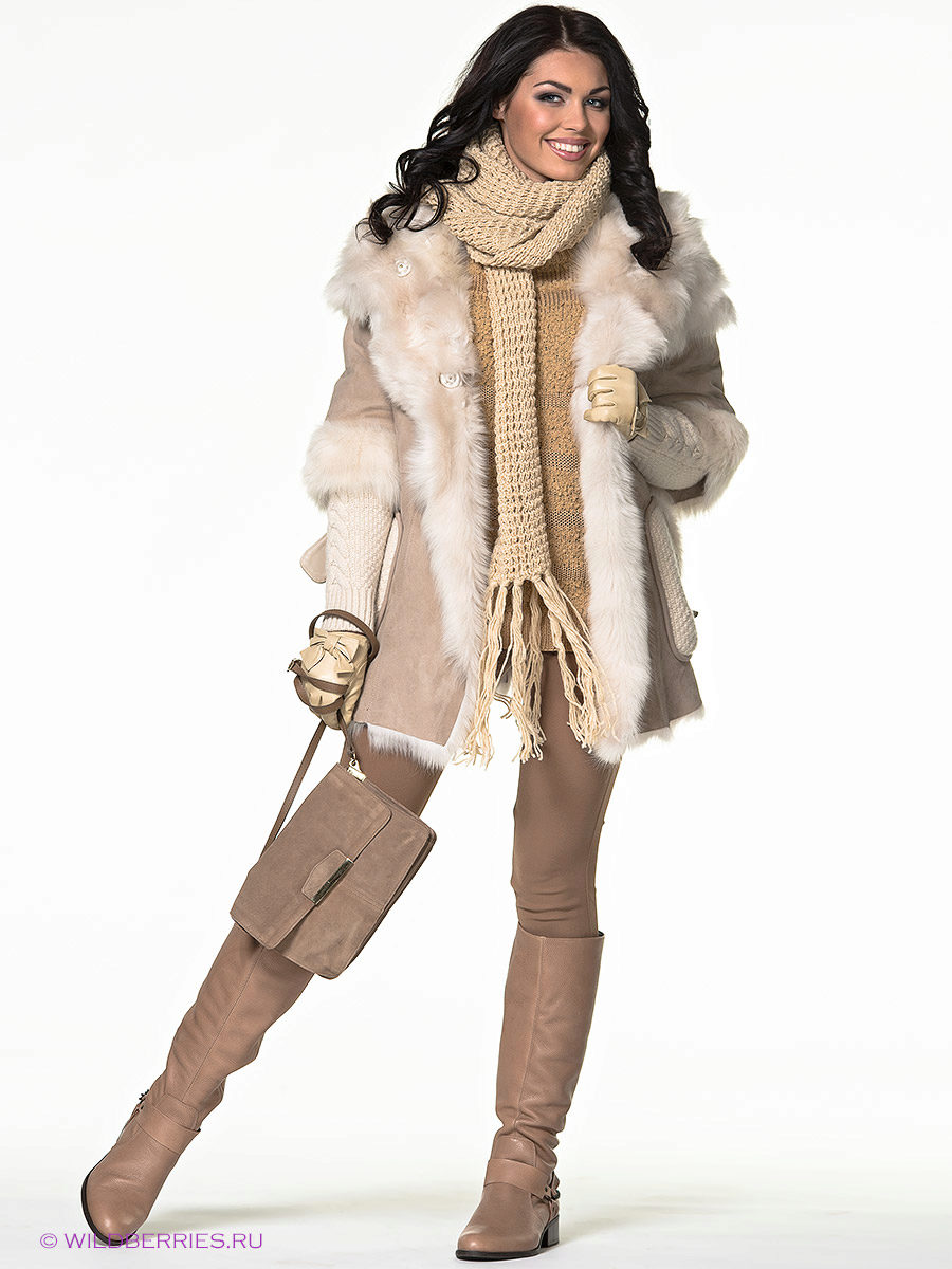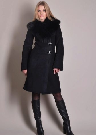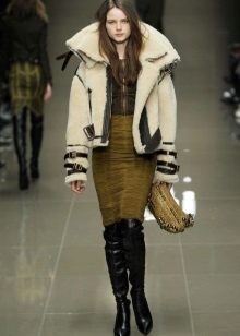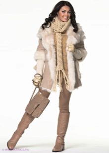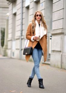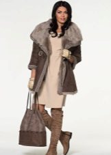 Regardless of what length and style the sheepskin coat will be, high boots that reach the middle of the calf or even the knee are always appropriate with it. The heel of such shoes should be small, it is allowed and its complete absence.
