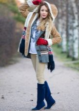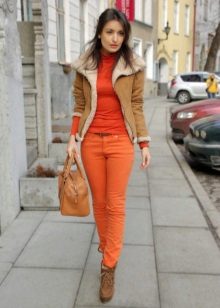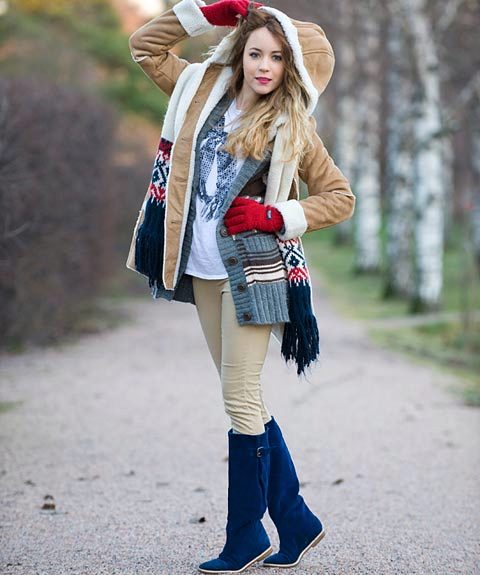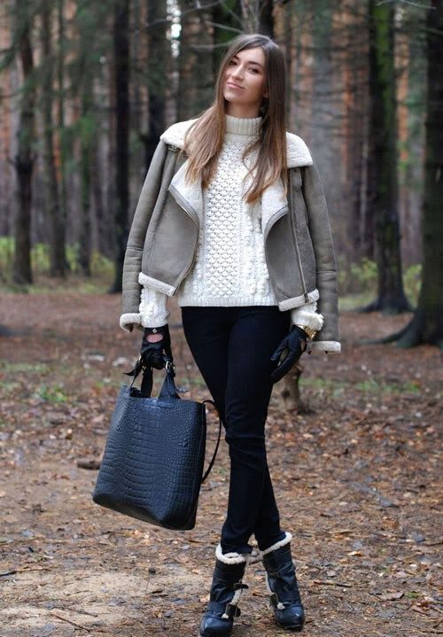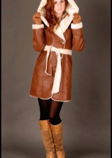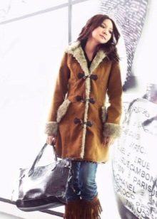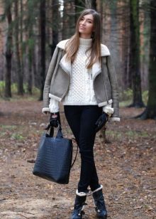 A short sheepskin coat and a fitted model of medium length can be combined with fashionable and popular uggs, as long as they match the sheepskin coat in color and texture.