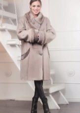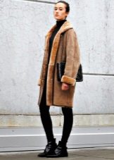 - The stylish sheepskin coat of a more traditional style is perfectly combined with short skirts or knitted dresses, boots-boots with heels or wedges can be used as shoes.As a headdress to sheepskin coat, you can wear a beret or a tipple over your head.