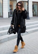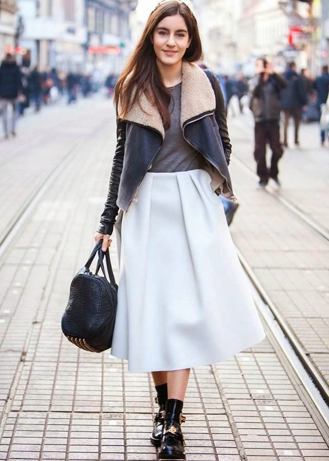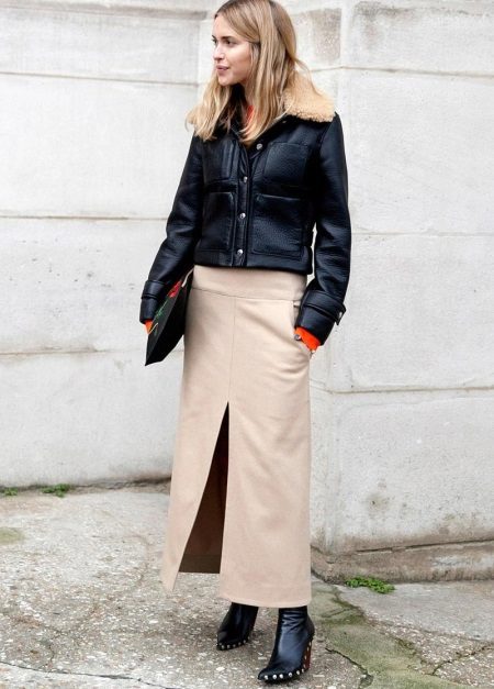 Casual, very stylish image of a cropped black leather sheepskin coat with a beige sheepskin collar, a beige long skirt with a slit in front and spectacular boots with rivets at the edging.
