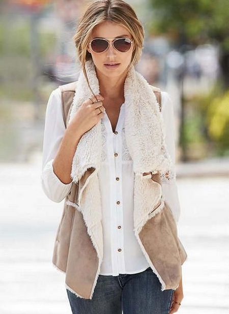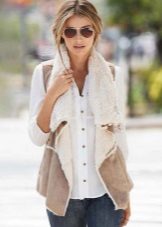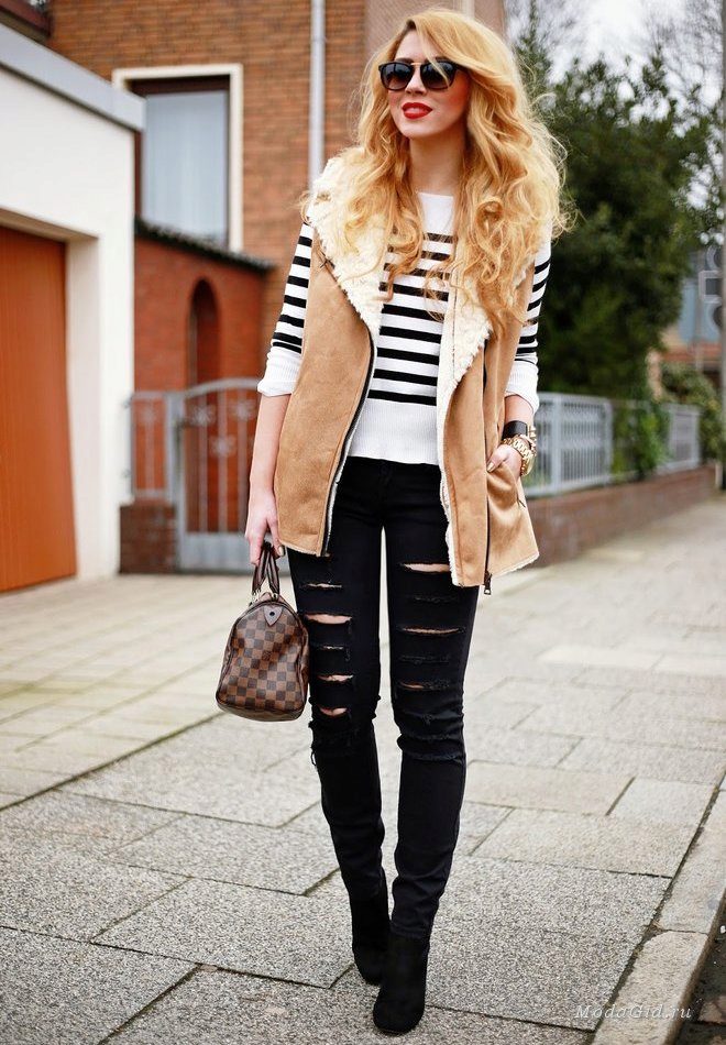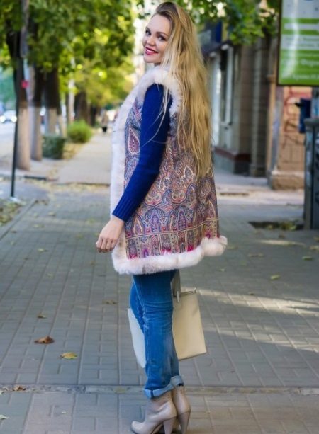 Artificial sheepskin coat without sleeves in Russian style, sweater, jeans and ankle boots.